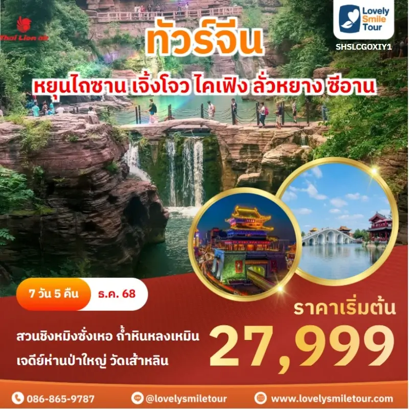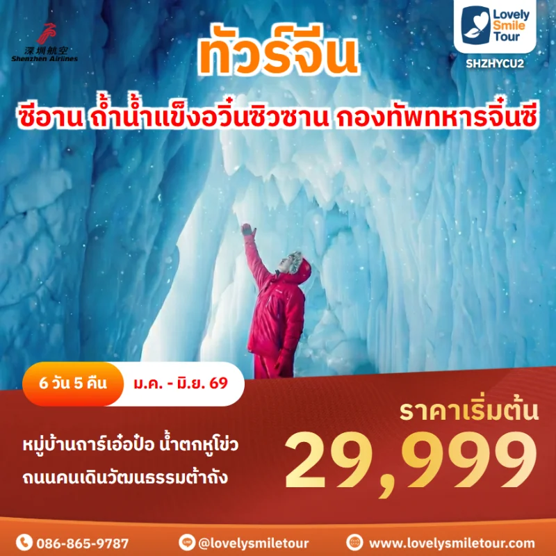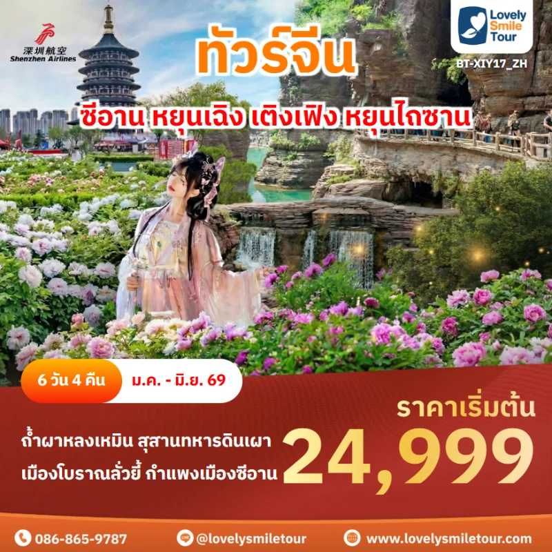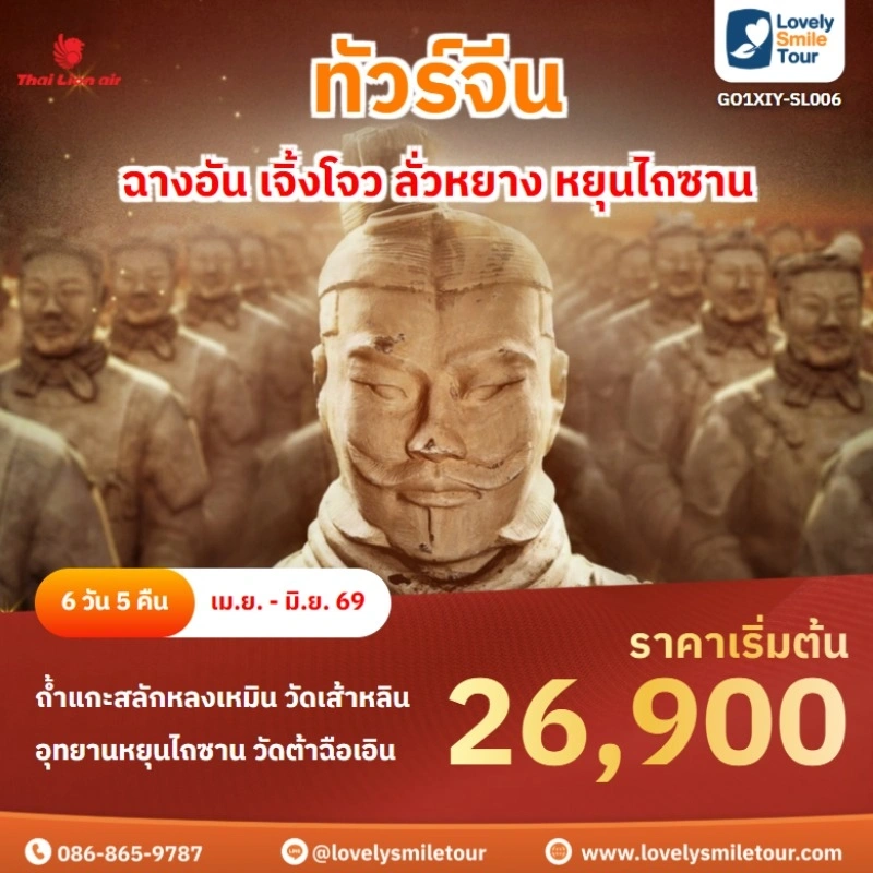 Lovely Smile Tour มีแพ็กเกจ ทัวร์ซีอาน ให้เลือกหลายรูปแบบ มีทั้งแบบไม่เข้าร้านรัฐบาลและแบบเข้าร้านรัฐบาล พักโรงแรมระดับ 4-5 ดาว สายการบินมีทั้งแบบ Full Service และ Low Cost หากสนใจจองแพ็กเกจไหน แอดไลน์หรือโทรสอบถามได้เลย