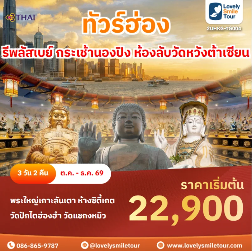 ทัวร์ฮ่องกง เป็นประเทศที่ครบเครื่องทั้งด้านวัฒนธรรม ความสนุก และการช้อปปิ้ง เดินทางง่ายใช้เวลาเดินทางแค่ประมาณ 3 ชั่วโมง เหมาะกับทุกเพศทุกวัยและเหมาะกับทุกสาย ไม่ว่าจะเป็นสายช้อป หรือสายมู ทัวร์ฮ่องกงจึงเป็นประเทศที่ต้องมาเที่ยวกันให้ได้สักครั้งเลย หากใครที่สนใจทัวร์ฮ่องกง สามารถแอดไลน์ LINE ID : @lovelysmiletour สอบถามได้เลย