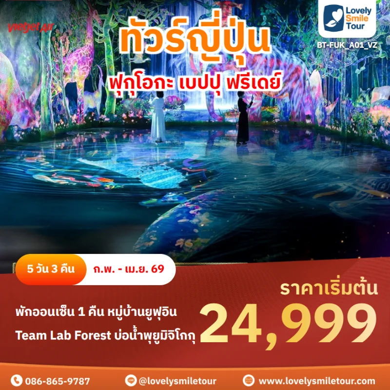 Lovely Smile Tour มีแพ็กเกจ ทัวร์เบปปุ ซึ่งตั้งอยู่บนชายฝั่งทะเลตะวันออกของเกาะคิวชูในประเทศญี่ปุ่น เป็นเมืองท่องเที่ยวออนแชน น้ำพุร้อน ยอดนิยมของญี่ปุ่น โดยจัดเป็นเมืองที่มีรีสอร์ทน้ำแร่มากที่สุด เที่ยวชมหมู่บ้านยูฟุอิน ที่เป็นต้นแบบของหมู่บ้าน OTOP ของประเทศญี่ปุ่น ซึ่งภายในเมืองมีทะเลสาบ Lake Kinrin โดยทะเลสาบแห่งนี้ที่เป็นจุดชมใบไม้เปลี่ยนสีที่งดงามอีกแห่งหนึ่ง อีกทั้งยังประกอบไปด้วยร้านค้าขายของพื้นเมือง ผักและผลไม้สด ของที่ระลึก Handmade น่ารักๆ อีกมากมาย แล้วยังมีบ่อนรกเบปปุ จิโกคุเมกุร หรือ บ่อน้ำพุร้อนขุมนรกทั้งแปดที่เป็นไฮไลท์สำคัญของเมืองนี้ โดยเป็นบ่อน้ำพุร้อนธรรมชาติที่เกิดขึ้นภายหลังจากการระเบิดของภูเขาไฟ ทำให้ประกอบไป ด้วยแร่ธาตุที่เข้มข้นมากมาย สนใจจองแพ็กเกจไหน แอดไลน์หรือโทรสอบถามได้เลย