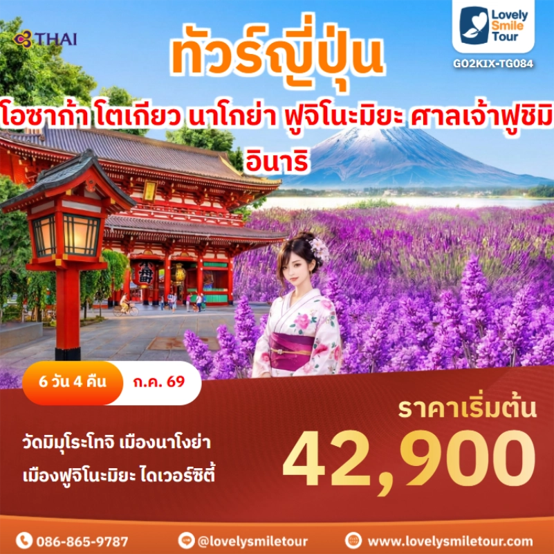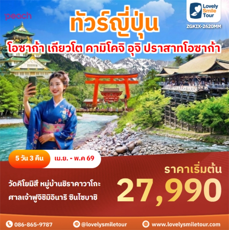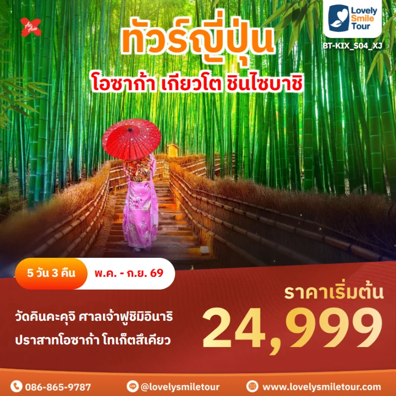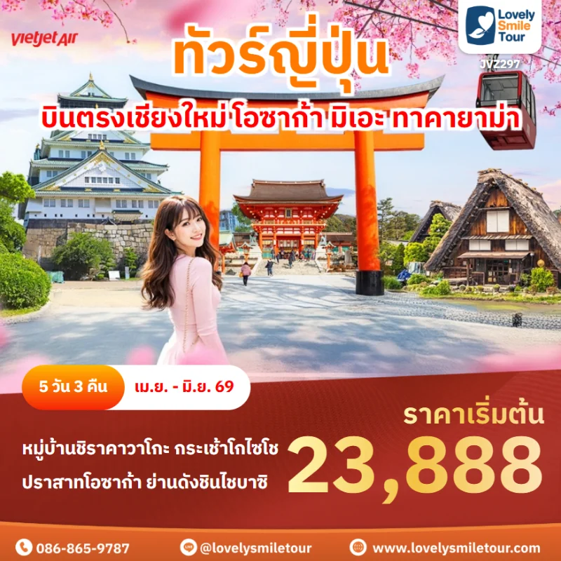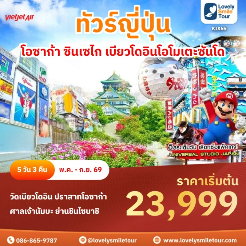 Lovely Smile Tour มีแพ็กเกจ ทัวร์โอซาก้า หลากหลายแพ็กเกจให้เลือก โอซาก้าเป็นเมืองที่มีสถานที่ท่องเที่ยวให้เที่ยวครบ ทั้งวัด สวนสนุก สถาปัตยกรรมญี่ปุ่นแบบโบราณ และย่านช็อปปิ้ง ซึ่งมีความสวยงามไม่แพ้โตเกียว สถานที่ท่องเที่ยวที่ที่เด่นๆ จะมีปราสาทโอซาก้า สวนอนุสรณ์งานเอ๊กซ์โป 70 ย่านโดทงโบริ ย่านชินไซบาชิ และยังมีสวนสนุกชื่อดังอย่างยูนิเวอร์แซลสตูดิโอส์เจแปนอีกด้วย ถ้าสนใจจองแพ็กเกจไหน แอดไลน์หรือโทรสอบถามได้เลย