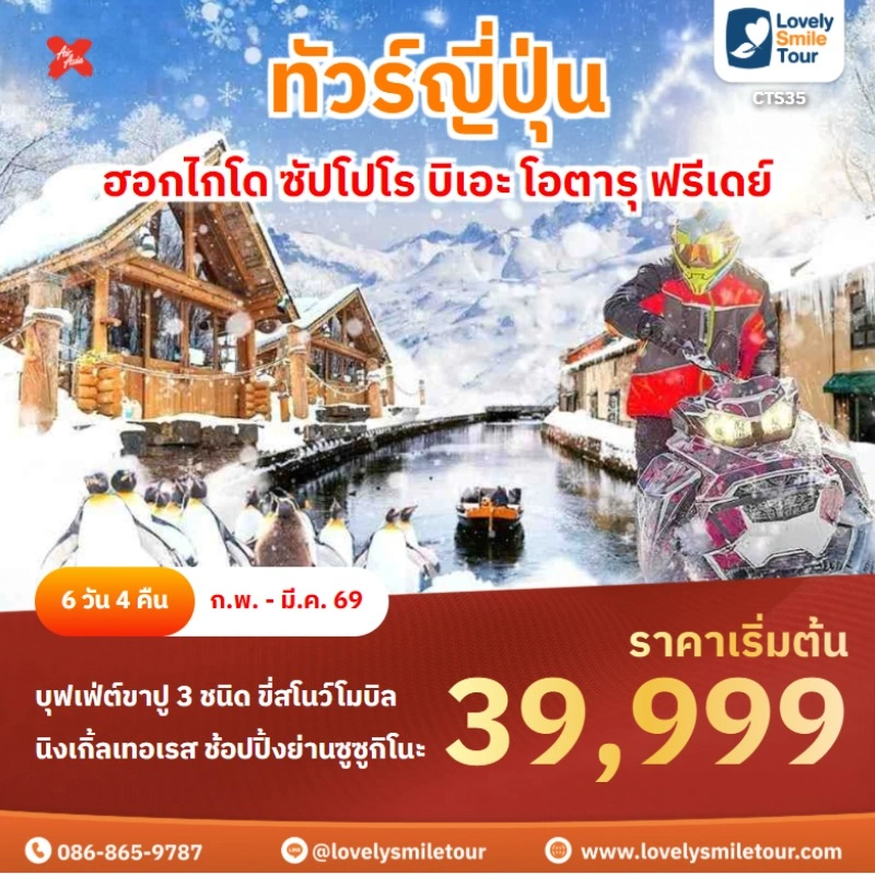 Lovely Smile Tour มีแพ็กเกจ ทัวร์โอตารุ หลากหลายแพ็กเกจให้เลือกหลายแบบ พักโรงแรมระดับ 3 ดาว มีทั้งบิน Full Service และ Low Cost โดยช่วงที่นักท่องเที่ยวนิยมไปมากที่สุด คือ ช่วงใบไม้เปลี่ยนสี ในช่วงปลายเดือนตุลาคม ถึงเดือนพฤศจิกายน หากสนใจจองแพ็กเกจไหน แอดไลน์หรือโทรสอบถามได้เลย
