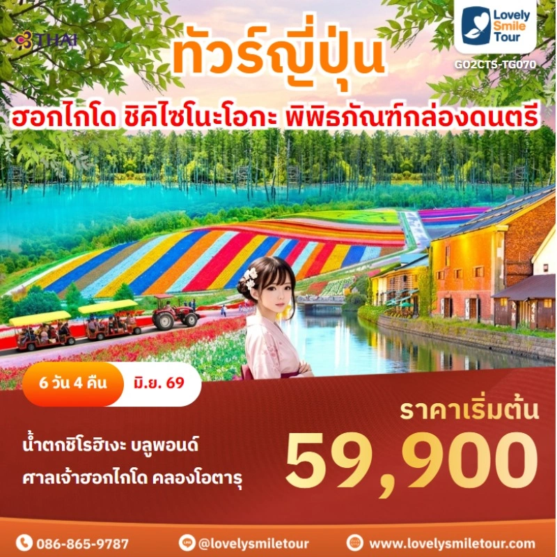 Lovely Smile Tour มีแพกเก็จ ทัวร์ญี่ปุ่น ให้เลือกหลากหลายเส้นทาง ไม่ว่าจะเป็น ฮอกไกโด โตเกียว โอซาก้า ทาคายาม่า ฟุกุโอกะ และมีหลากหลายสายการบินทั้ง Low Cost และ Full Service ซึ่งกรุ๊ปมีเดินทางทุกสัปดาห์ โดยเฉพาะอย่างยิ่ง ถ้าเป็นสงกรานต์ หรือปีใหม่ แนะนำให้จองล่วงหน้าอย่างน้อย 2 เดือน สนใจจองแพ็กเกจไหน แอดไลน์หรือโทรสอบถามได้เลย