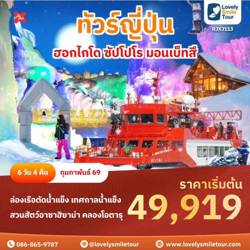 Lovely Smile Tour มีแพ็กเกจ ทัวร์ซัปโปโร หลากหลายแพ็กเกจให้เลือก โดยซัปโปโร เป็นเมืองยอดนิยมที่คนไปเที่ยวกันค่อนข้างเยอะในช่วงฤดูหนาว เป็นเมืองที่มีหิมะตกตั้งแต่ช่วงปลายเดือนธันวาคมไปจนถึงเดือนมีนาคม ถ้าเดินทางช่วงต้นเดือนกุมภาพันธ์จะได้ไปชมเทศกาลหิมะอีกด้วย ไฮไลท์ที่สำคัญจะอยู่ที่ เมืองโอตารุ พิพิธภัณฑ์กล่องดนตรี หอนาฬิกาซัปโปโร สวนหมีภูเขาไฟโชวะซินซัน เป็นสถานที่เพาะพันธุ์หมีสีน้ำตาล ซึ่งสามารถชมได้อย่างใกล้ชิด ถ้าสนใจจองแพ็กเกจไหน แอดไลน์หรือโทรสอบถามได้เลย