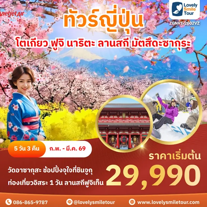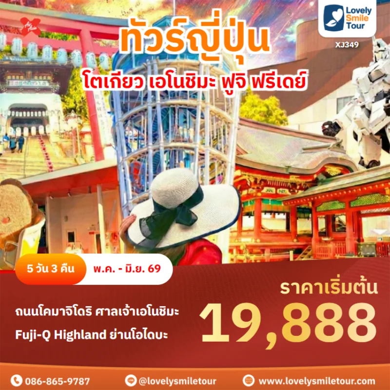 Lovely Smile Tour มีแพ็กเกจ ทัวร์โตเกียว หลากหลายแพ็กเกจให้เลือก โดยโตเกียวถือเป็นเมืองที่คนนิยมไปเที่ยวกันเป็นอันดับต้นๆ สถานที่ท่องเที่ยวเด่นๆ ก็จะมีภูเขาไฟฟูจิ คาวากูจิโกะ วัดอาซากุสะ ย่านช็อปปิ้งฮาราจุกุ ชิบูย่า และยังมีสวนสนุกชื่อดังอย่างดิสนีย์แลนด์ ดิสนีย์ซีอีกด้วย สำหรับท่านใดที่พาเด็กๆ มาเที่ยวด้วย บอกได้เลยว่าถูกใจแน่นอน และสำหรับท่านที่เดินทางไปญี่ปุ่นครั้งแรกก็แนะนำเลย มีที่เที่ยวครบทั้งแหล่งธรรมชาติ วัด ศาลเจ้า ย่านช็อปปิ้งต่างๆ ถ้าสนใจจองแพ็กเกจไหน แอดไลน์หรือโทรสอบถามได้เลย
