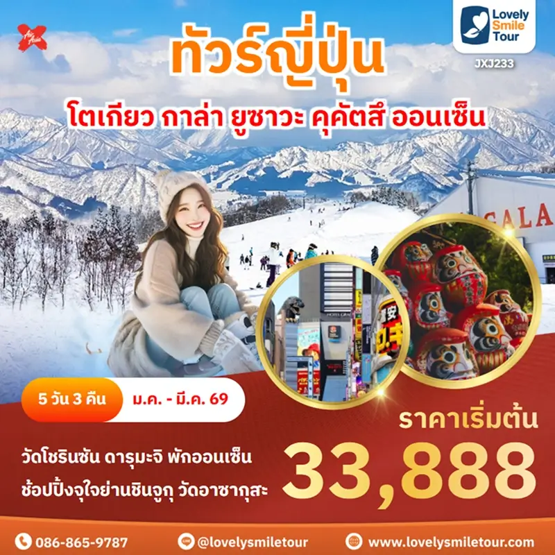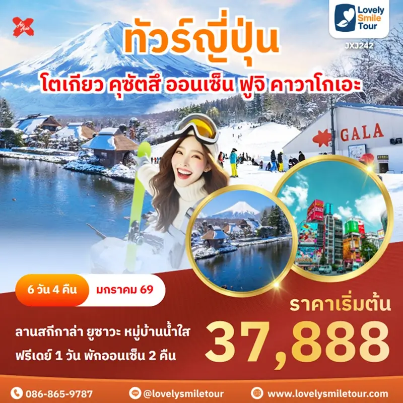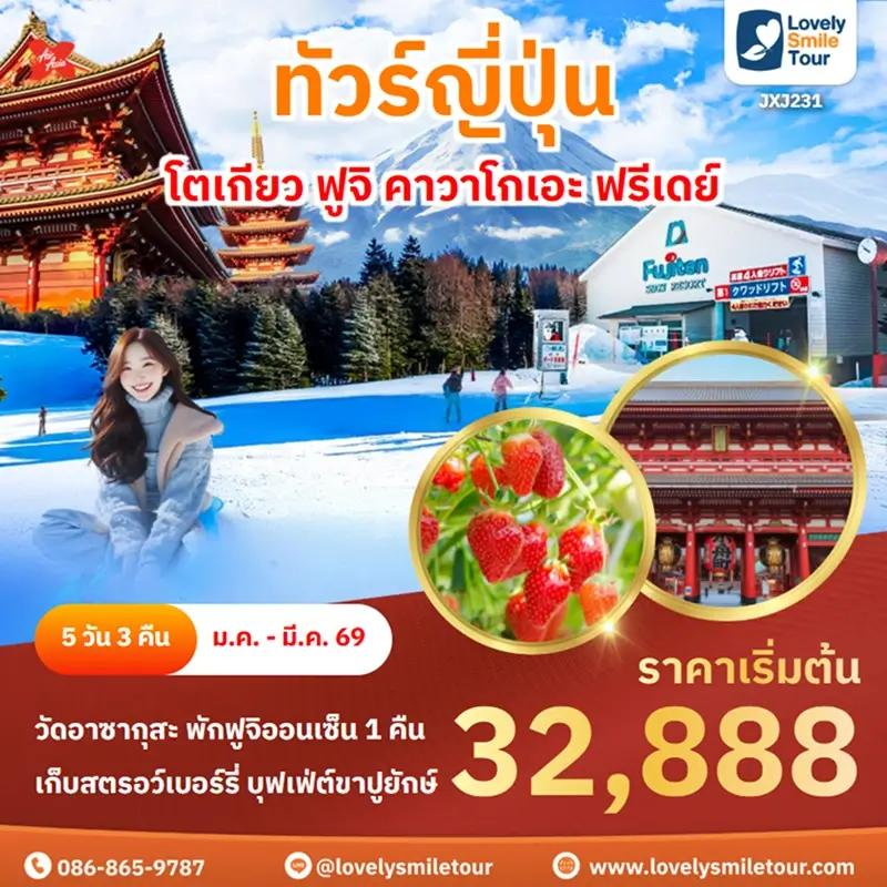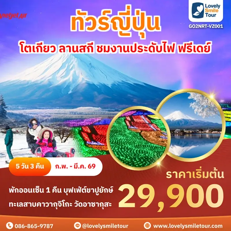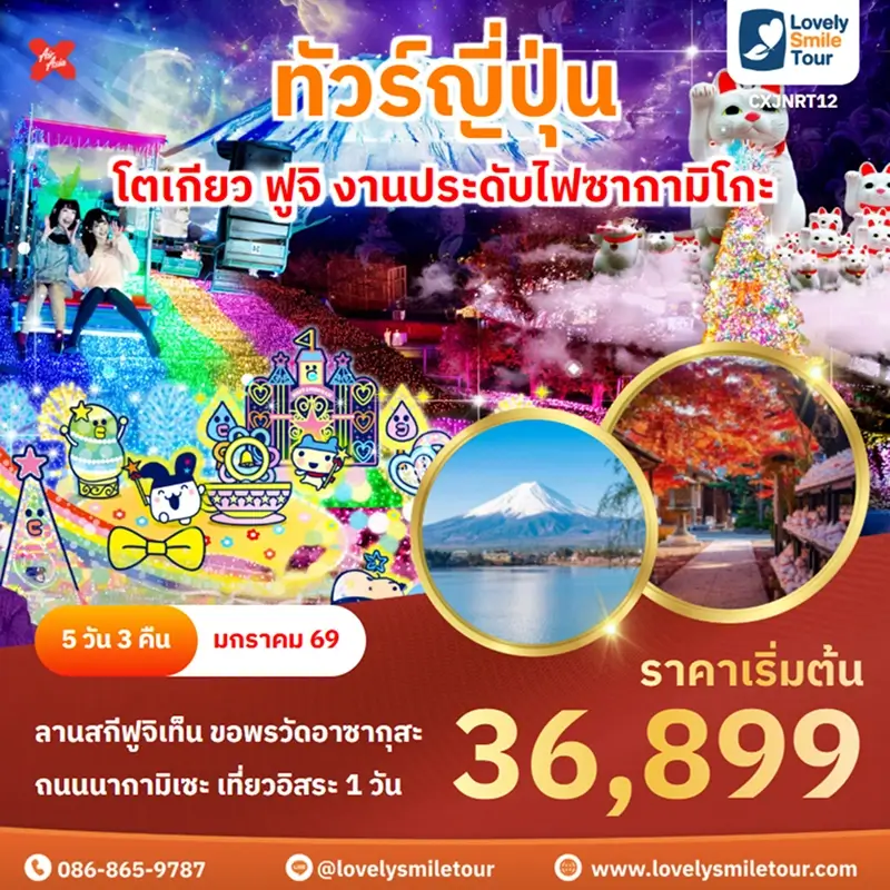Lovely Smile Tour มีแพ็กเกจ ทัวร์โตเกียว หลากหลายแพ็กเกจให้เลือก โดยโตเกียวถือเป็นเมืองที่คนนิยมไปเที่ยวกันเป็นอันดับต้นๆ สถานที่ท่องเที่ยวเด่นๆ ก็จะมีภูเขาไฟฟูจิ คาวากูจิโกะ วัดอาซากุสะ ย่านช็อปปิ้งฮาราจุกุ ชิบูย่า และยังมีสวนสนุกชื่อดังอย่างดิสนีย์แลนด์ ดิสนีย์ซีอีกด้วย สำหรับท่านใดที่พาเด็กๆ มาเที่ยวด้วย บอกได้เลยว่าถูกใจแน่นอน และสำหรับท่านที่เดินทางไปญี่ปุ่นครั้งแรกก็แนะนำเลย มีที่เที่ยวครบทั้งแหล่งธรรมชาติ วัด ศาลเจ้า ย่านช็อปปิ้งต่างๆ ถ้าสนใจจองแพ็กเกจไหน แอดไลน์หรือโทรสอบถามได้เลย