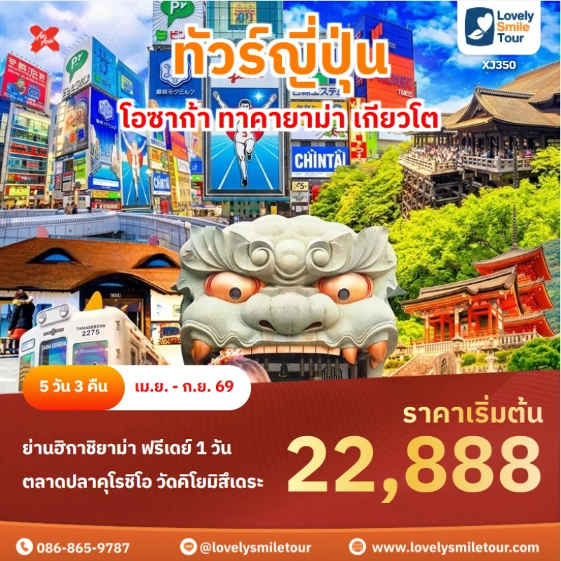 Lovely Smile Tour มีแพ็กเกจ ทัวร์เกียวโต หลากหลายแพ็กเกจให้เลือกหลายแบบ พักโรงแรมระดับ 3 ดาว มีทั้งบิน Full Service และ Low Cost โดยช่วงที่นักท่องเที่ยวนิยมไปมากที่สุด คือ ช่วงใบไม้เปลี่ยนสี ในช่วงปลายเดือนตุลาคม ถึงเดือนพฤศจิกายน หากสนใจจองแพ็กเกจไหน แอดไลน์หรือโทรสอบถามได้เลย
