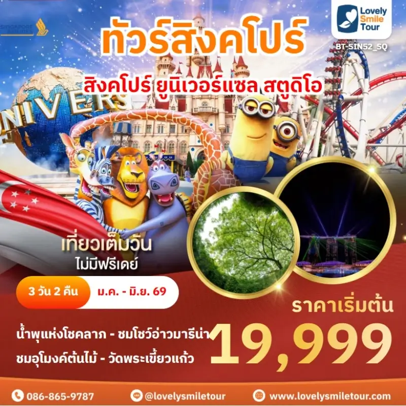 Lovely Smile Tour มีแพ็กเกจ ทัวร์สิงคโปร์ Universal Studios Singapore หลากหลายรูปแบบให้เลือก ทั้งแบบ 3 วัน 2 คืน แบบ 4 วัน 3 คืน พาเที่ยวทุกวัน มีไกด์ มีรถบัสบริการ สามารถซื้อบัตร Universal กับทางบริษัทได้เลย สนใจจองแพ็กเกจไหน สามารถแอดไลน์ หรือโทรสอบถามได้เลย