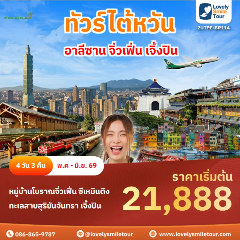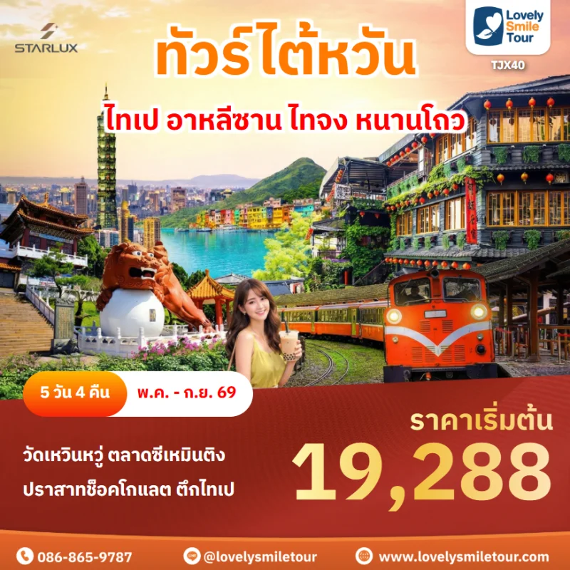 Lovely Smile Tour มีแพ็กเกจ ทัวร์ไต้หวัน ให้เลือกหลายรูปแบบ โดยรูปแบบหลักๆ จะมี 2 อย่างคือ แพ็กเกจทัวร์ 4 วัน 3 คืน และ 5 วัน 4 คืน ถ้าต้องการเที่ยวครบ แนะนำให้ไปแบบ 5 วัน 4 คืน ซึ่งจะทำให้ได้ไปเที่ยวอุทยานแห่งชาติอาลีซาน นอกจากนี้ โปรแกรมทัวร์จะแตกต่างกันในเรื่องสายการบิน ระดับโรงแรม ร้านอาหารมื้อพิเศษ สนใจจองแพ็กเกจไหน แอดไลน์หรือโทรสอบถามได้เลย