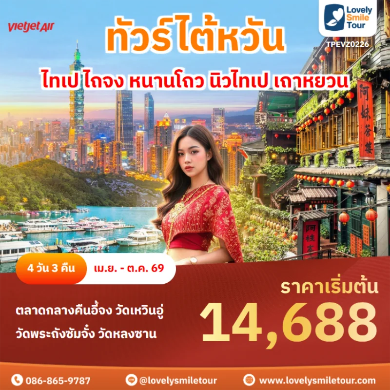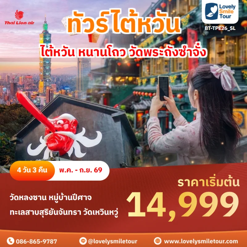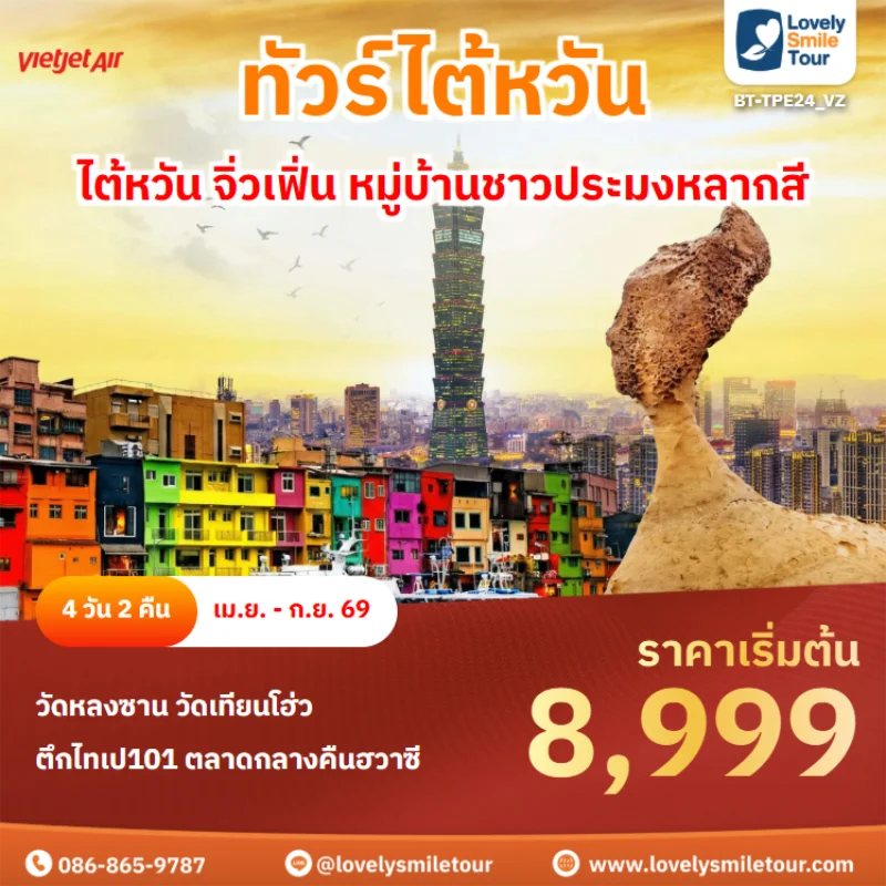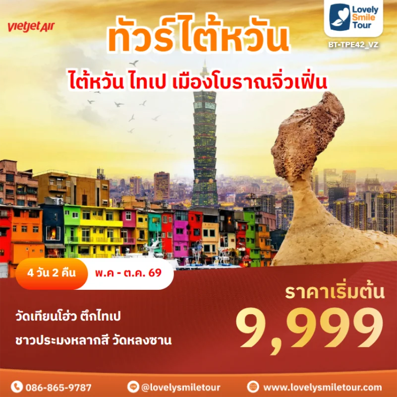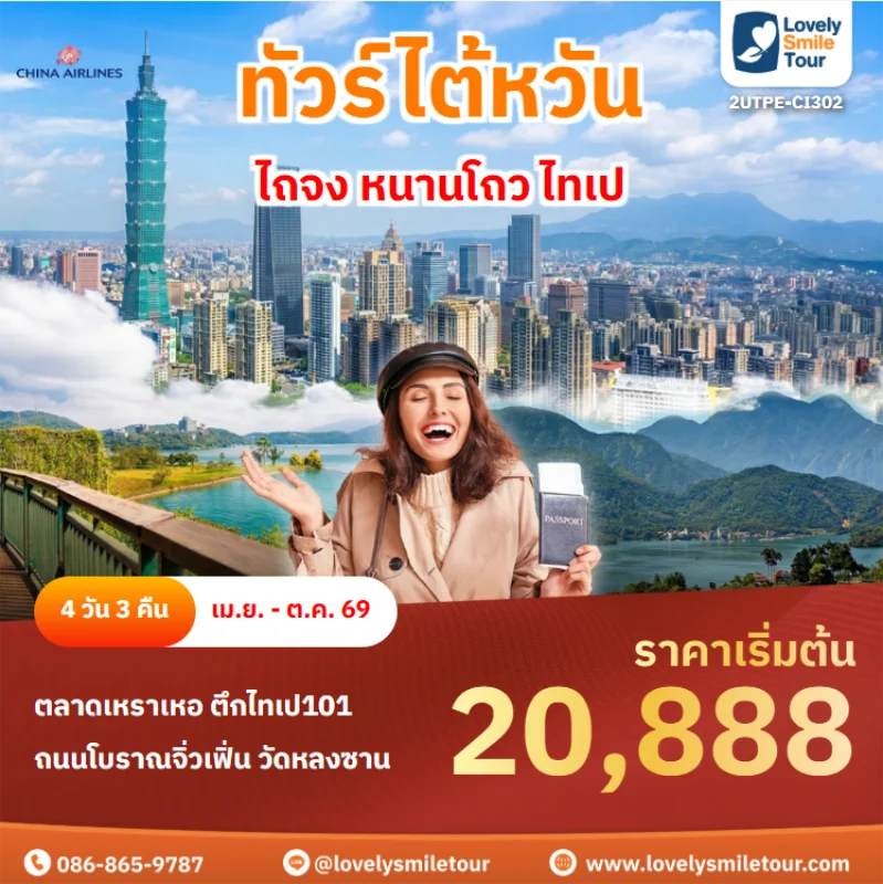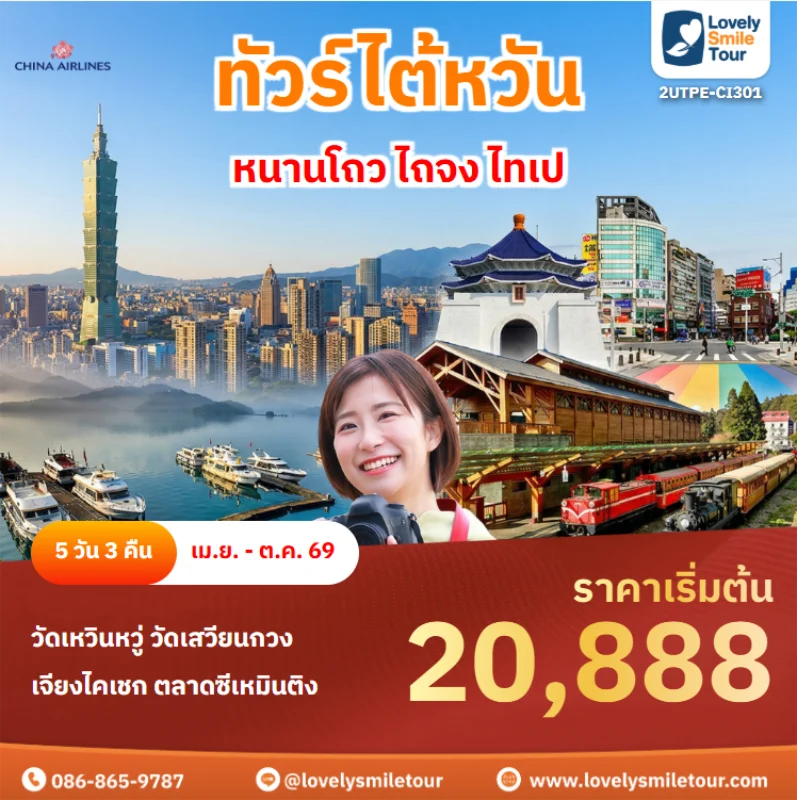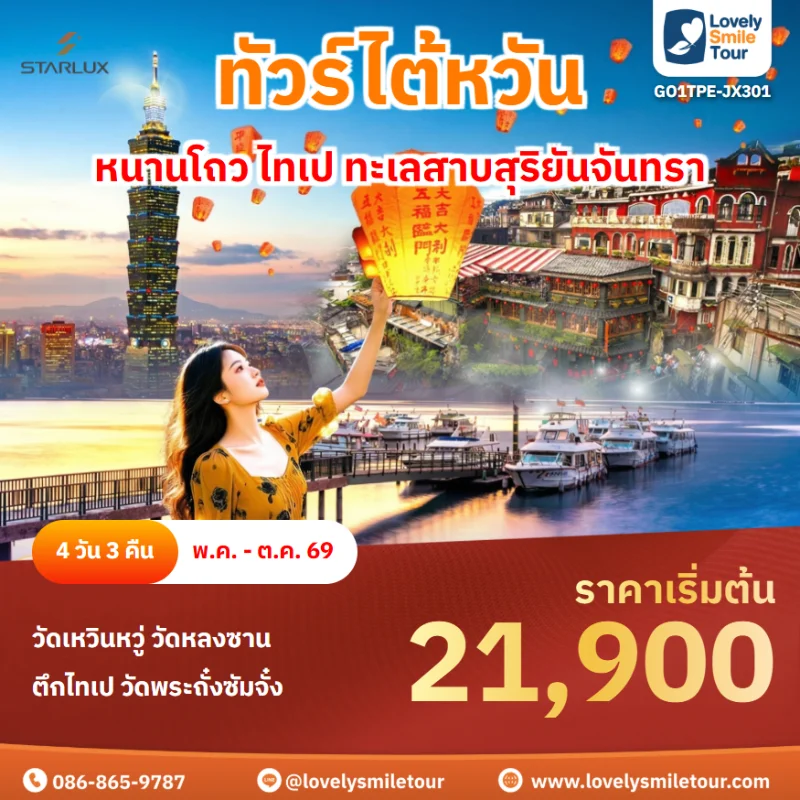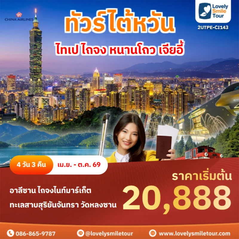 ไต้หวันเป็นอีกหนึ่งประเทศที่เป็นที่นิยมในการท่องเที่ยวเป็นอย่างมาก ไม่ว่าจะเป็นธรรมชาติที่งดงาม ภูเขา น้ำตก หมอก ทะเล และหมู่เกาะที่สวยงาม อีกทั้งยังมีเมืองโบราณและสถานที่สำคัญที่มีชื่อเสียงมากมายที่ได้รับความนิยมในหมู่นักท่องเที่ยว สนใจจองทัวร์ไต้หวัน สามารถแอดไลน์สอบถามได้เลยค่ะ LINE ID : @lovelysmiletour