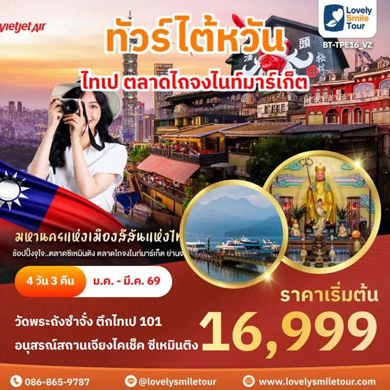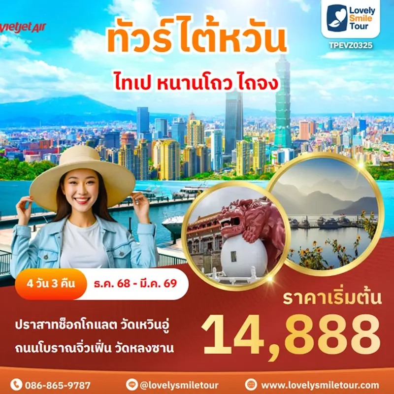 ไต้หวันเป็นอีกหนึ่งประเทศที่เป็นที่นิยมในการท่องเที่ยวเป็นอย่างมาก ไม่ว่าจะเป็นธรรมชาติที่งดงาม ภูเขา น้ำตก หมอก ทะเล และหมู่เกาะที่สวยงาม อีกทั้งยังมีเมืองโบราณและสถานที่สำคัญที่มีชื่อเสียงมากมายที่ได้รับความนิยมในหมู่นักท่องเที่ยว สนใจจองทัวร์ไต้หวัน สามารถแอดไลน์สอบถามได้เลยค่ะ LINE ID : @lovelysmiletour