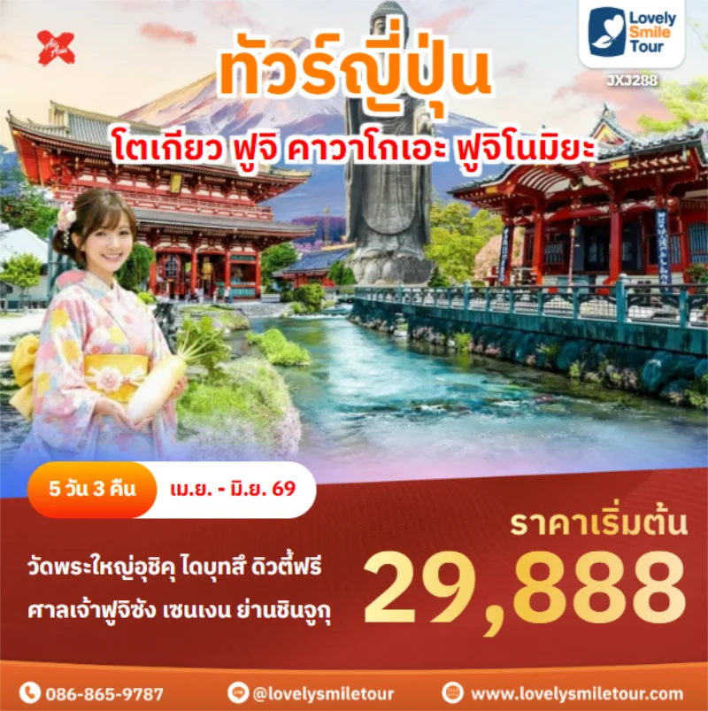 Lovely Smile Tour มีแพ็กเกจ ทัวร์โตเกียว หลากหลายแพ็กเกจให้เลือก โดยโตเกียวถือเป็นเมืองที่คนนิยมไปเที่ยวกันเป็นอันดับต้นๆ สถานที่ท่องเที่ยวเด่นๆ ก็จะมีภูเขาไฟฟูจิ คาวากูจิโกะ วัดอาซากุสะ ย่านช็อปปิ้งฮาราจุกุ ชิบูย่า และยังมีสวนสนุกชื่อดังอย่างดิสนีย์แลนด์ ดิสนีย์ซีอีกด้วย สำหรับท่านใดที่พาเด็กๆ มาเที่ยวด้วย บอกได้เลยว่าถูกใจแน่นอน และสำหรับท่านที่เดินทางไปญี่ปุ่นครั้งแรกก็แนะนำเลย มีที่เที่ยวครบทั้งแหล่งธรรมชาติ วัด ศาลเจ้า ย่านช็อปปิ้งต่างๆ ถ้าสนใจจองแพ็กเกจไหน แอดไลน์หรือโทรสอบถามได้เลย