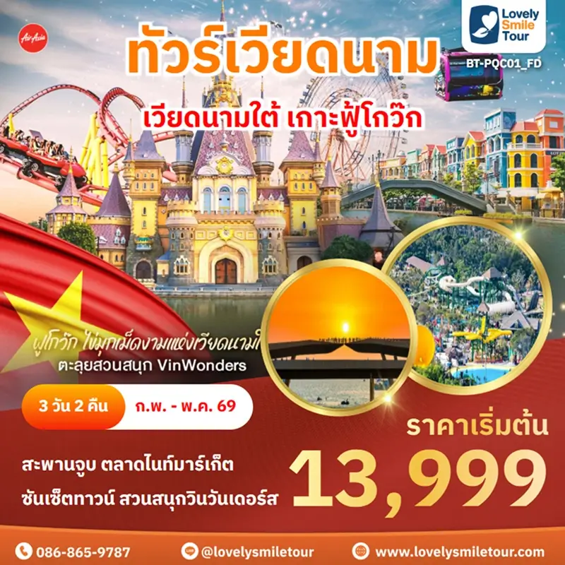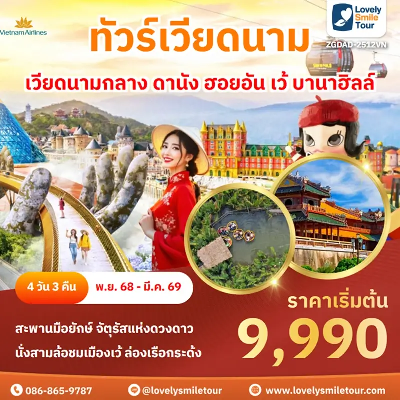 Lovely Smile Tour มีแพ็กเกจ ทัวร์เวียดนาม เหนือ กลาง ใต้ ให้เลือกหลายหลายรูปแบบ โดยแพ็กเกจที่เป็นที่นิยมจะเป็น ทัวร์เวียดนามกลาง 4 วัน 3 คืน ซึ่งเป็นโปรแกรมเที่ยวที่มีสถานที่เที่ยวหลากหลาย ไม่ว่าจะเป็นเที่ยวบานาฮิลล์ เที่ยวธรรมชาติ โบราณสถาน ล่องเรือ ช้อปปิ้ง และที่สำคัญเดินทางไม่เหนื่อยด้วย แต่ถ้าชอบเที่ยวธรรมชาติ ชมวิวบนเขา แนะนำเวียดนามเหนือ ซาปา ฟานซิปัน หรือถ้าชอบชมทะเลทราย สวนดอกไม้ แนะนำเวียดนามใต้ สนใจจองแพ็กเกจไหน แอดไลน์หรือโทรสอบถามได้เลย