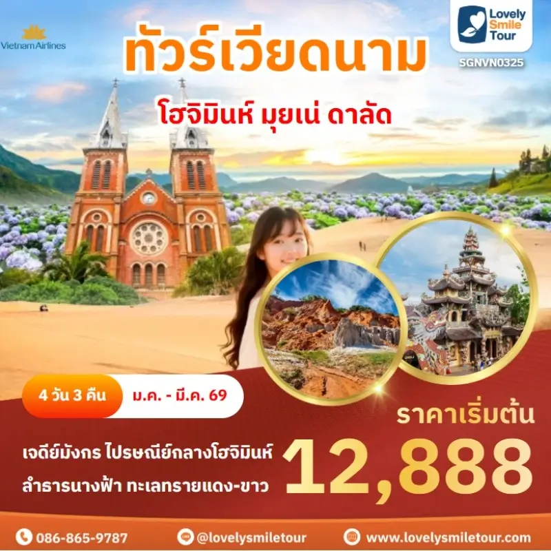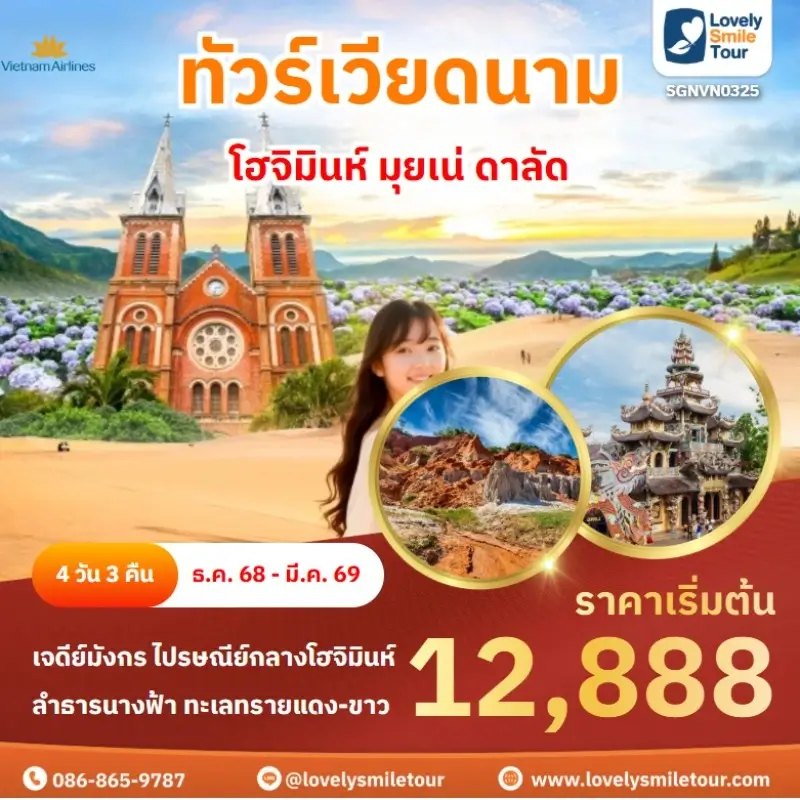 Lovely Smile Tour มีแพ็กเกจ ทัวร์เวียดนาม เหนือ กลาง ใต้ ให้เลือกหลายหลายรูปแบบ โดยแพ็กเกจที่เป็นที่นิยมจะเป็น ทัวร์เวียดนามกลาง 4 วัน 3 คืน ซึ่งเป็นโปรแกรมเที่ยวที่มีสถานที่เที่ยวหลากหลาย ไม่ว่าจะเป็นเที่ยวบานาฮิลล์ เที่ยวธรรมชาติ โบราณสถาน ล่องเรือ ช้อปปิ้ง และที่สำคัญเดินทางไม่เหนื่อยด้วย แต่ถ้าชอบเที่ยวธรรมชาติ ชมวิวบนเขา แนะนำเวียดนามเหนือ ซาปา ฟานซิปัน หรือถ้าชอบชมทะเลทราย สวนดอกไม้ แนะนำเวียดนามใต้ สนใจจองแพ็กเกจไหน แอดไลน์หรือโทรสอบถามได้เลย