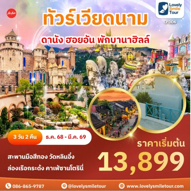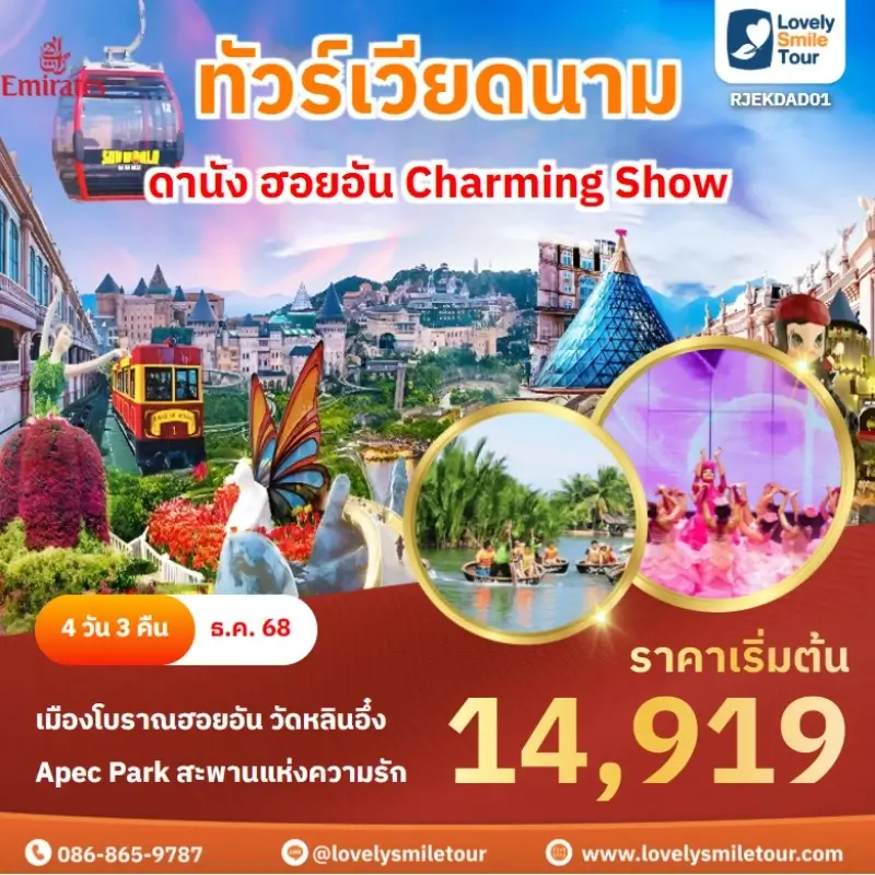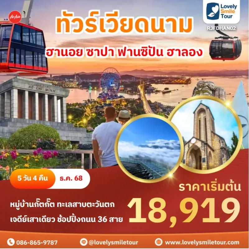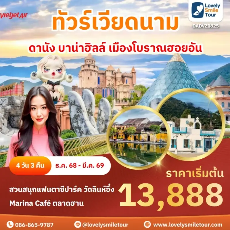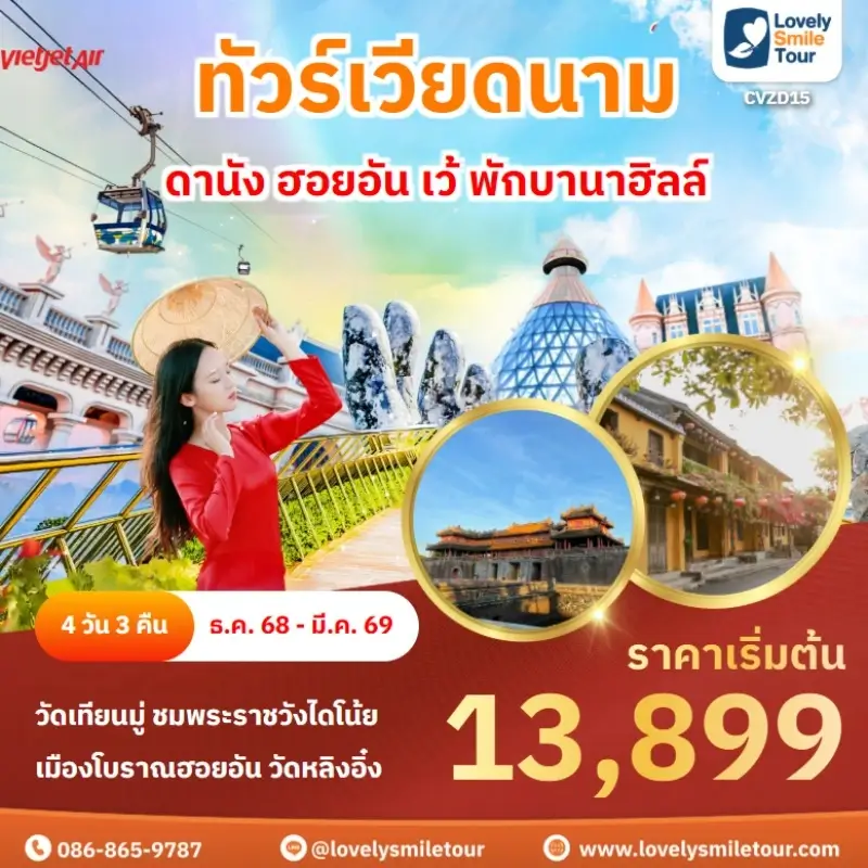 Lovely Smile Tour มีแพ็กเกจ ทัวร์เวียดนาม เหนือ กลาง ใต้ ให้เลือกหลายหลายรูปแบบ โดยแพ็กเกจที่เป็นที่นิยมจะเป็น ทัวร์เวียดนามกลาง 4 วัน 3 คืน ซึ่งเป็นโปรแกรมเที่ยวที่มีสถานที่เที่ยวหลากหลาย ไม่ว่าจะเป็นเที่ยวบานาฮิลล์ เที่ยวธรรมชาติ โบราณสถาน ล่องเรือ ช้อปปิ้ง และที่สำคัญเดินทางไม่เหนื่อยด้วย แต่ถ้าชอบเที่ยวธรรมชาติ ชมวิวบนเขา แนะนำเวียดนามเหนือ ซาปา ฟานซิปัน หรือถ้าชอบชมทะเลทราย สวนดอกไม้ แนะนำเวียดนามใต้ สนใจจองแพ็กเกจไหน แอดไลน์หรือโทรสอบถามได้เลย