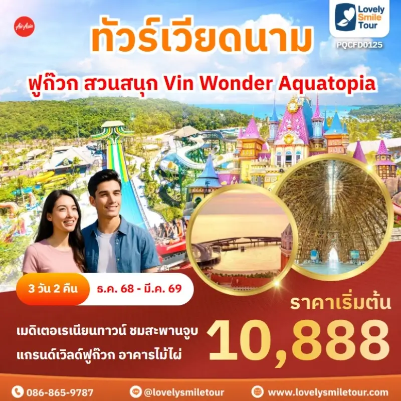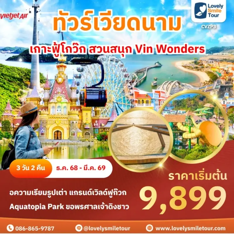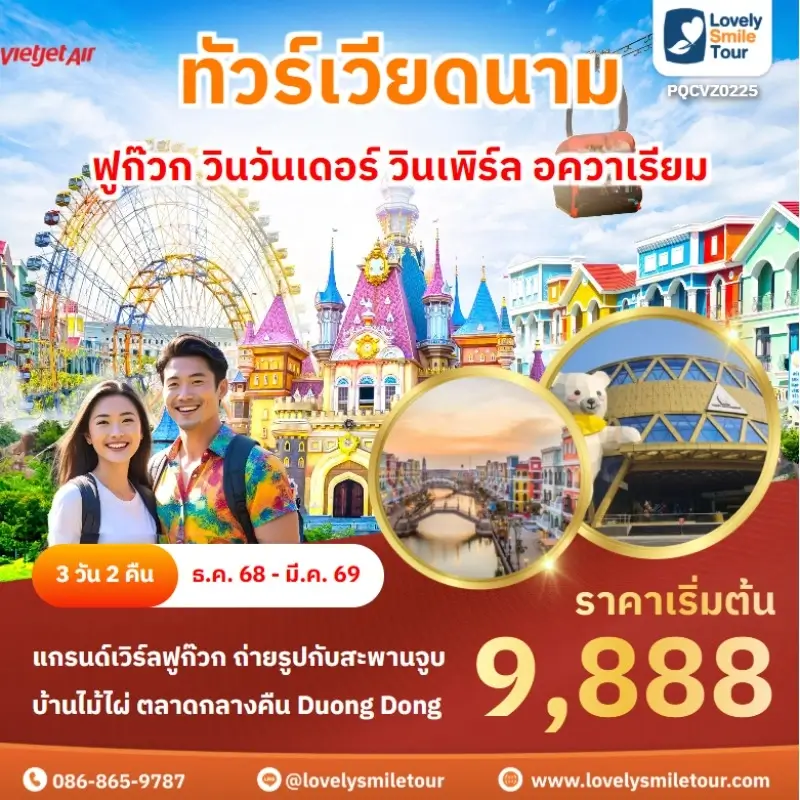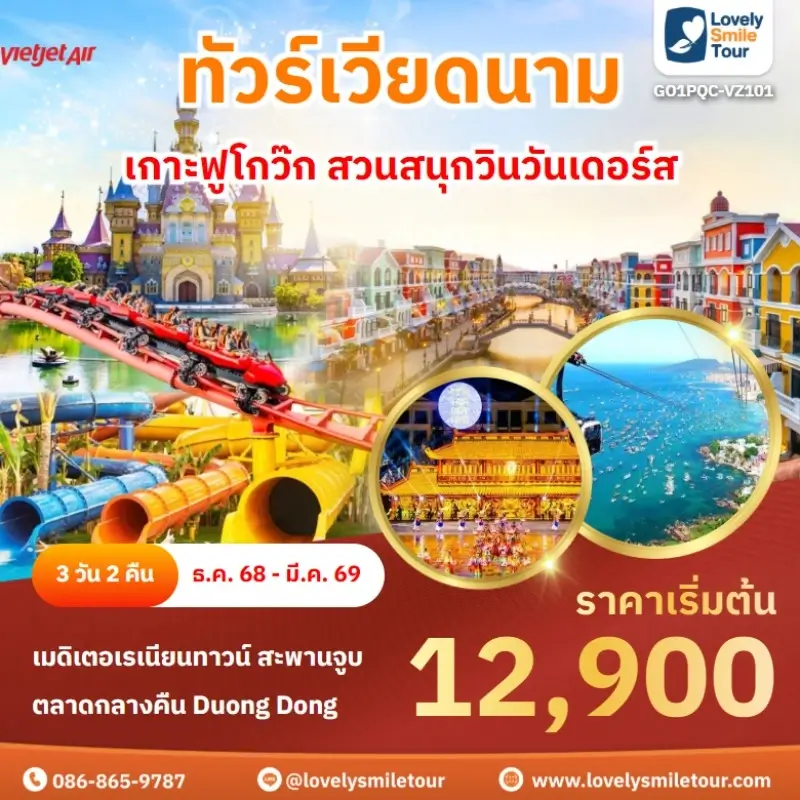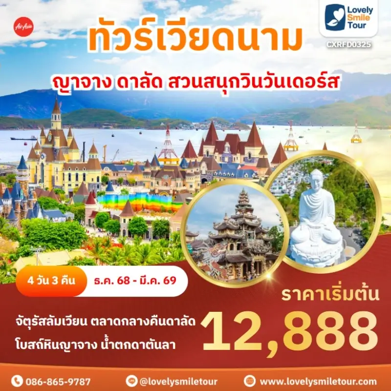 Lovely Smile Tour มีแพ็กเกจ ทัวร์เวียดนาม เหนือ กลาง ใต้ ให้เลือกหลายหลายรูปแบบ โดยแพ็กเกจที่เป็นที่นิยมจะเป็น ทัวร์เวียดนามกลาง 4 วัน 3 คืน ซึ่งเป็นโปรแกรมเที่ยวที่มีสถานที่เที่ยวหลากหลาย ไม่ว่าจะเป็นเที่ยวบานาฮิลล์ เที่ยวธรรมชาติ โบราณสถาน ล่องเรือ ช้อปปิ้ง และที่สำคัญเดินทางไม่เหนื่อยด้วย แต่ถ้าชอบเที่ยวธรรมชาติ ชมวิวบนเขา แนะนำเวียดนามเหนือ ซาปา ฟานซิปัน หรือถ้าชอบชมทะเลทราย สวนดอกไม้ แนะนำเวียดนามใต้ สนใจจองแพ็กเกจไหน แอดไลน์หรือโทรสอบถามได้เลย