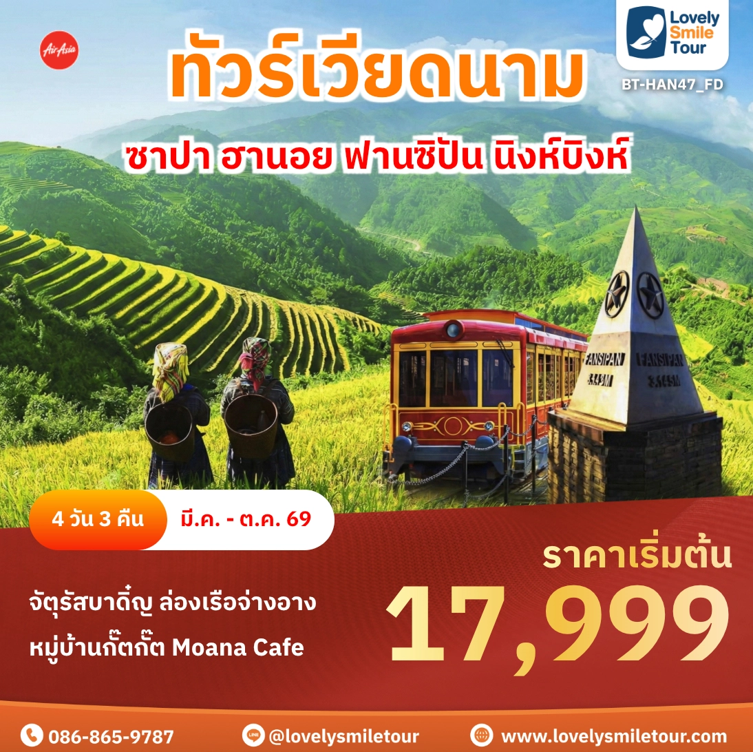 Lovely Smile Tour มีแพ็กเกจ ทัวร์เวียดนาม เหนือ กลาง ใต้ ให้เลือกหลายหลายรูปแบบ โดยแพ็กเกจที่เป็นที่นิยมจะเป็น ทัวร์เวียดนามกลาง 4 วัน 3 คืน ซึ่งเป็นโปรแกรมเที่ยวที่มีสถานที่เที่ยวหลากหลาย ไม่ว่าจะเป็นเที่ยวบานาฮิลล์ เที่ยวธรรมชาติ โบราณสถาน ล่องเรือ ช้อปปิ้ง และที่สำคัญเดินทางไม่เหนื่อยด้วย แต่ถ้าชอบเที่ยวธรรมชาติ ชมวิวบนเขา แนะนำเวียดนามเหนือ ซาปา ฟานซิปัน หรือถ้าชอบชมทะเลทราย สวนดอกไม้ แนะนำเวียดนามใต้ สนใจจองแพ็กเกจไหน แอดไลน์หรือโทรสอบถามได้เลย