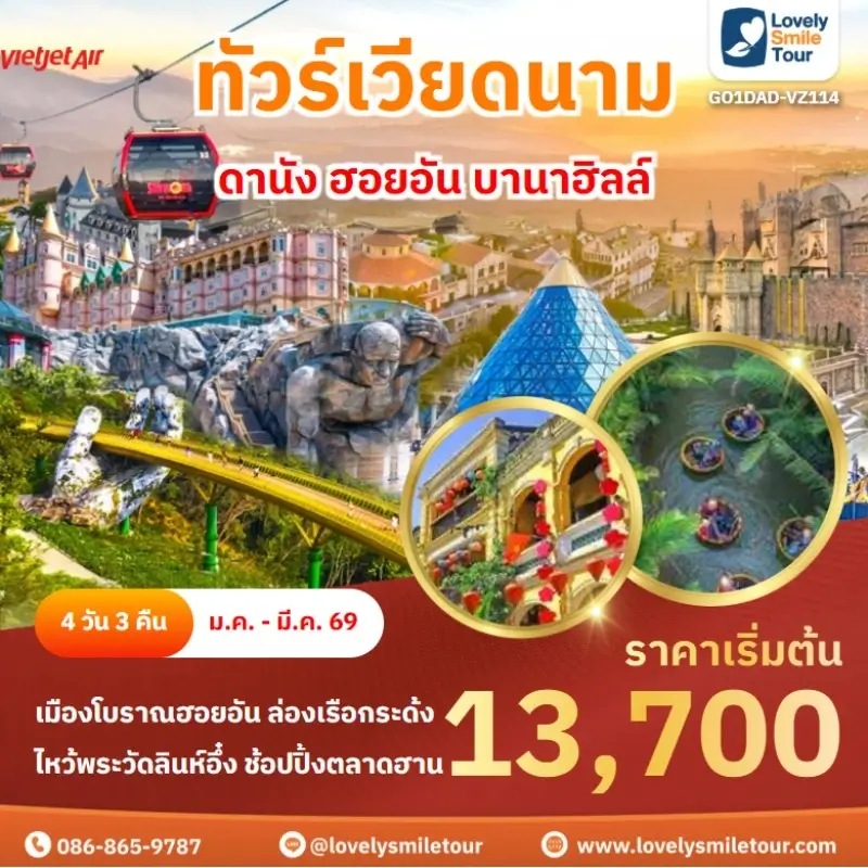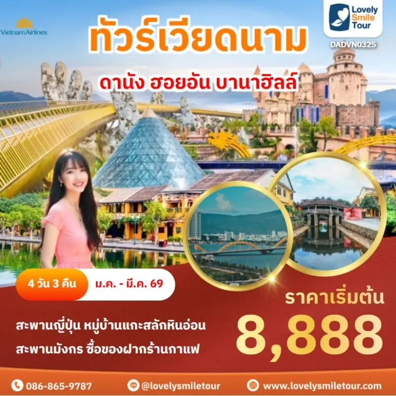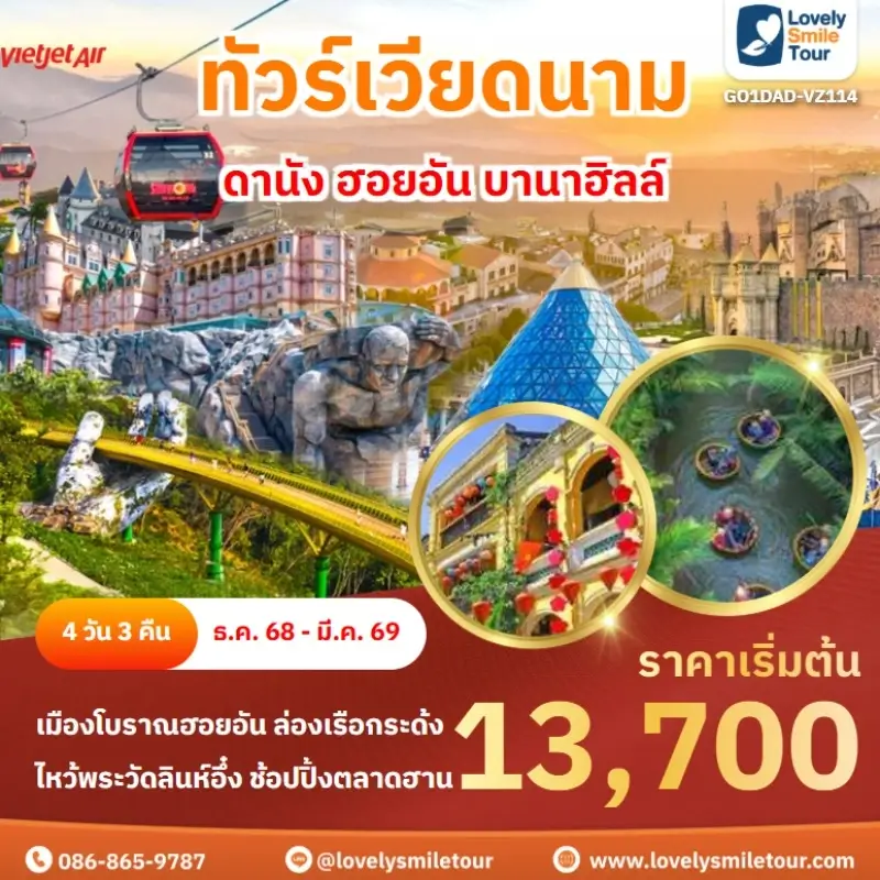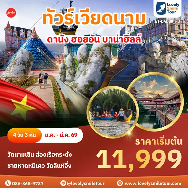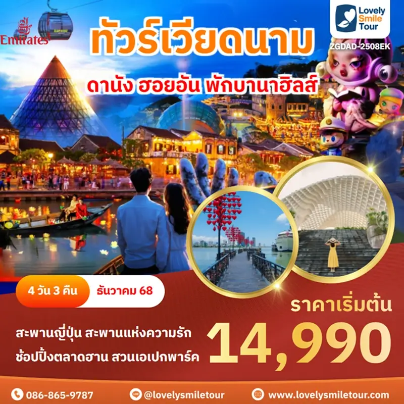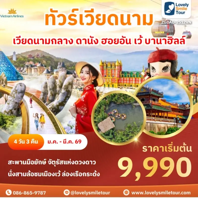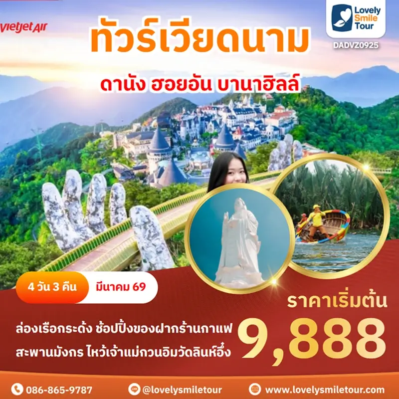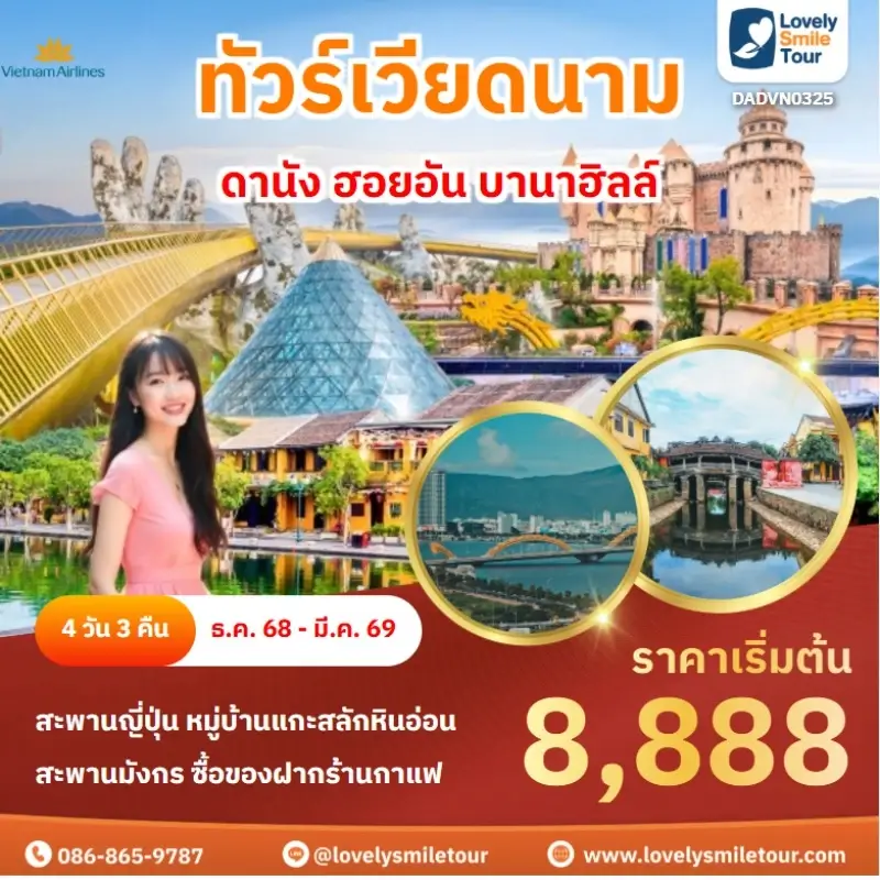 Lovely Smile Tour มีแพ็กเกจ ทัวร์เวียดนามกลาง หลากหลายรูปแบบให้เลือก ซึ่งถ้าต้องการให้ได้เที่ยวครบไฮไลท์สำคัญ แนะนำเป็นแบบ 4 วัน 3 คืน เพื่อให้ได้เที่ยวครบ 3 เมือง คือ ดานัง เว้ ฮอยอัน และแนะนำให้ลองพักบนบานาฮิลล์ 1 คืน และคืนที่เหลือพัก 4 ดาว ท่านจะประทับใจแน่นอน สนใจจองแพ็กเกจไหน แอดไลน์หรือโทรสอบถามได้เลย