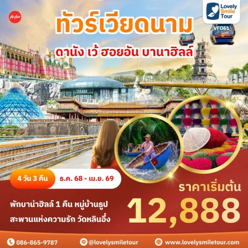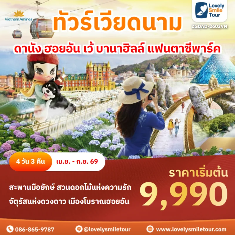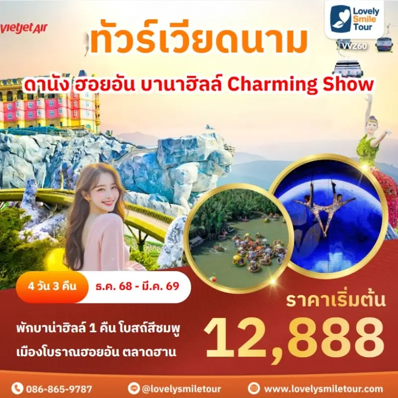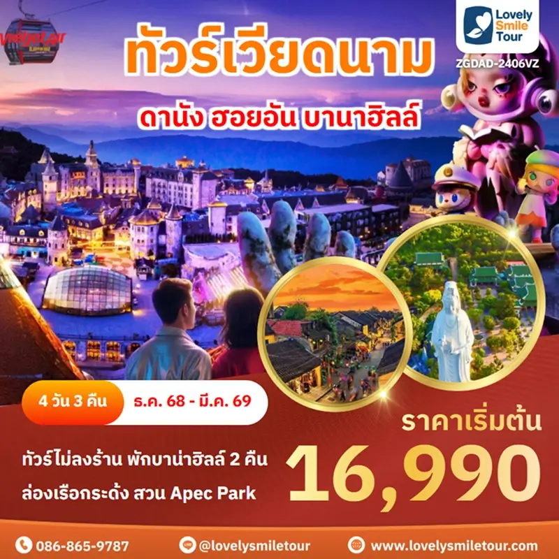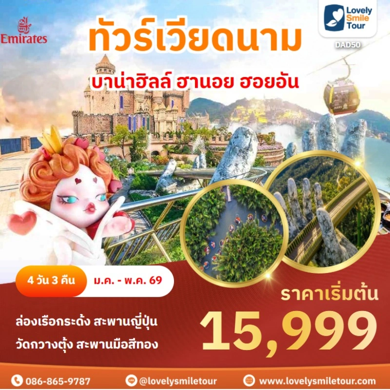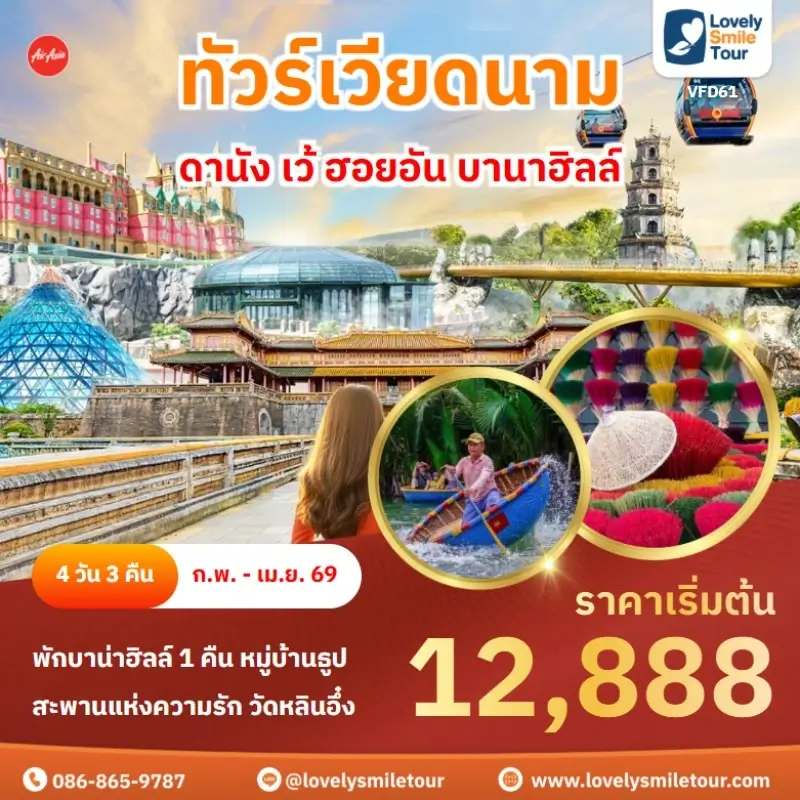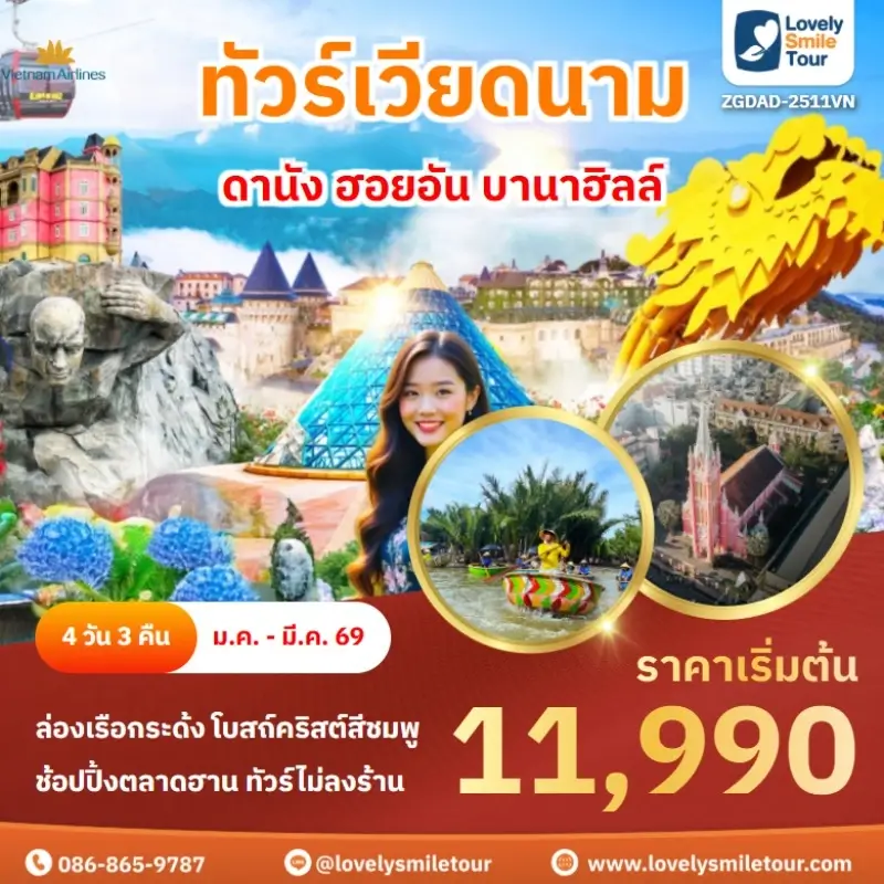 Lovely Smile Tour มีแพ็กเกจ ทัวร์เวียดนามกลาง หลากหลายรูปแบบให้เลือก ซึ่งถ้าต้องการให้ได้เที่ยวครบไฮไลท์สำคัญ แนะนำเป็นแบบ 4 วัน 3 คืน เพื่อให้ได้เที่ยวครบ 3 เมือง คือ ดานัง เว้ ฮอยอัน และแนะนำให้ลองพักบนบานาฮิลล์ 1 คืน และคืนที่เหลือพัก 4 ดาว ท่านจะประทับใจแน่นอน สนใจจองแพ็กเกจไหน แอดไลน์หรือโทรสอบถามได้เลย