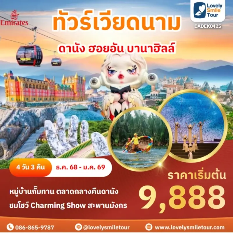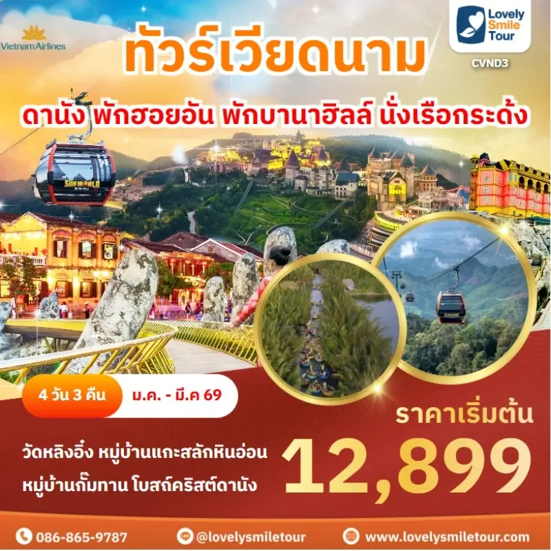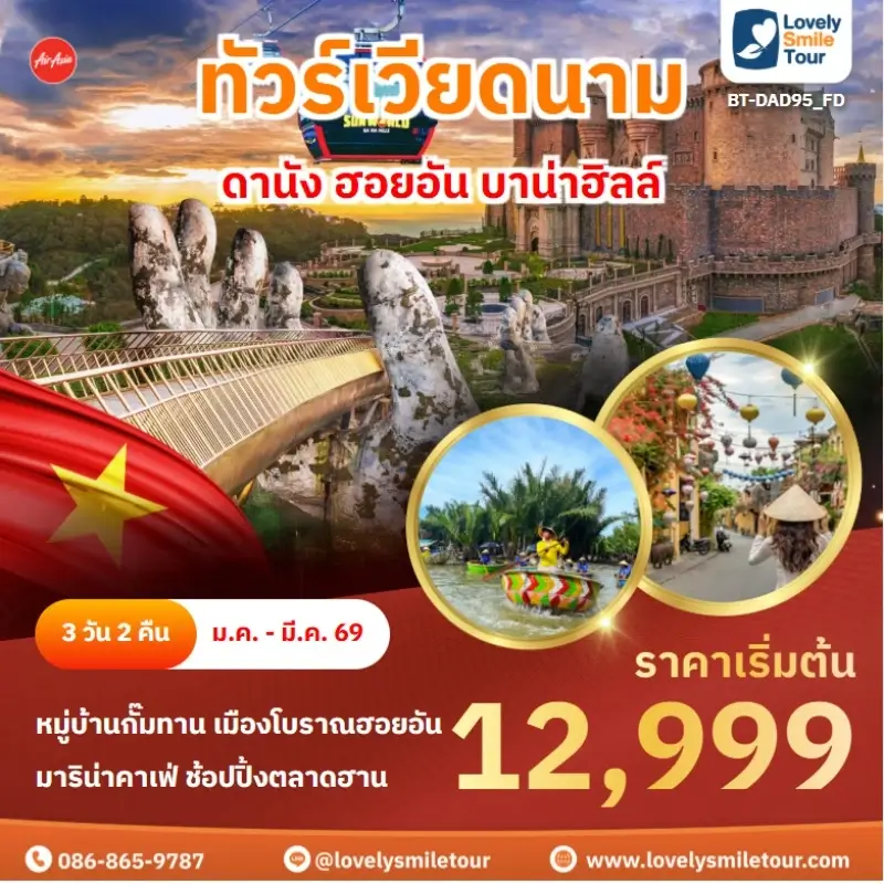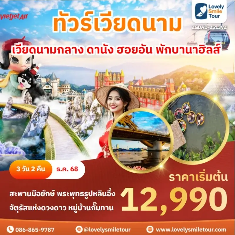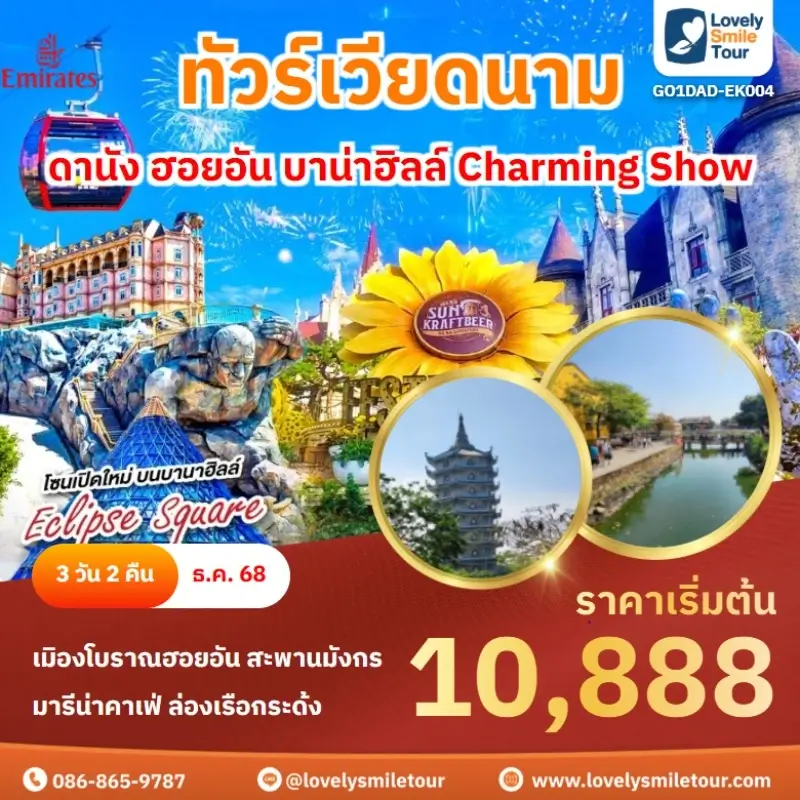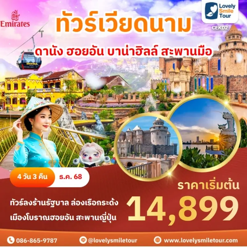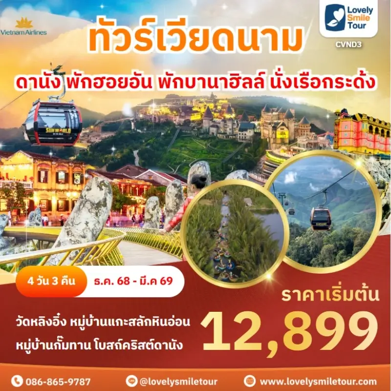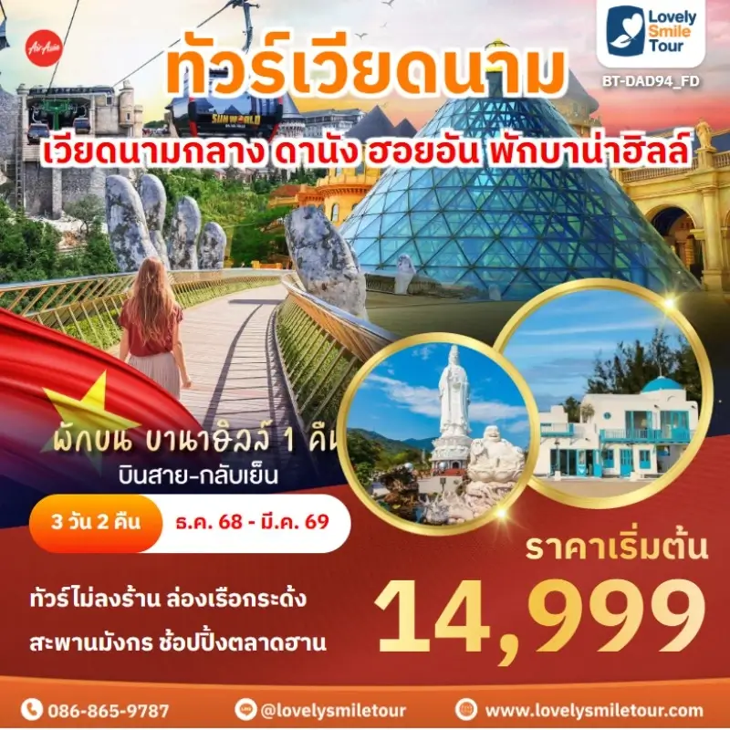 Lovely Smile Tour มีแพ็กเกจ ทัวร์เวียดนามกลาง หลากหลายรูปแบบให้เลือก ซึ่งถ้าต้องการให้ได้เที่ยวครบไฮไลท์สำคัญ แนะนำเป็นแบบ 4 วัน 3 คืน เพื่อให้ได้เที่ยวครบ 3 เมือง คือ ดานัง เว้ ฮอยอัน และแนะนำให้ลองพักบนบานาฮิลล์ 1 คืน และคืนที่เหลือพัก 4 ดาว ท่านจะประทับใจแน่นอน สนใจจองแพ็กเกจไหน แอดไลน์หรือโทรสอบถามได้เลย