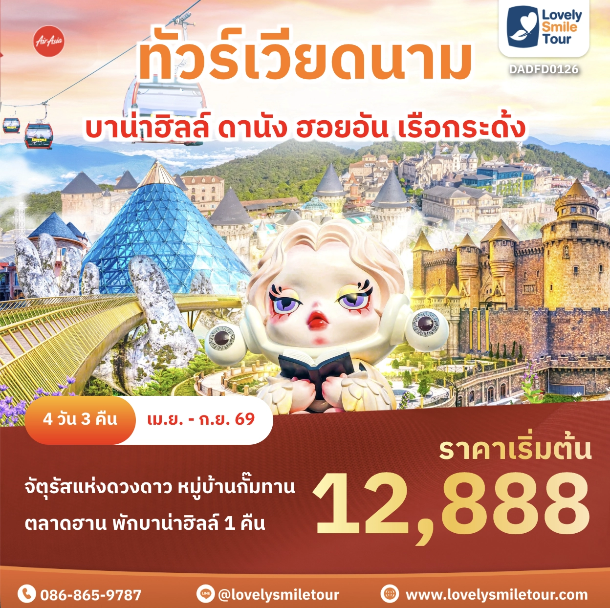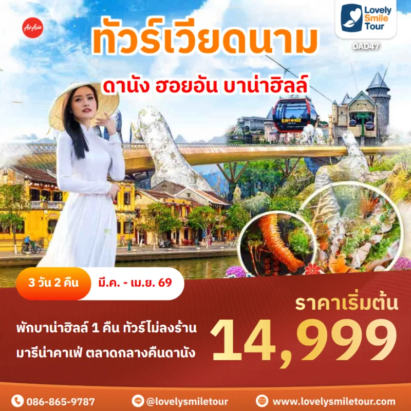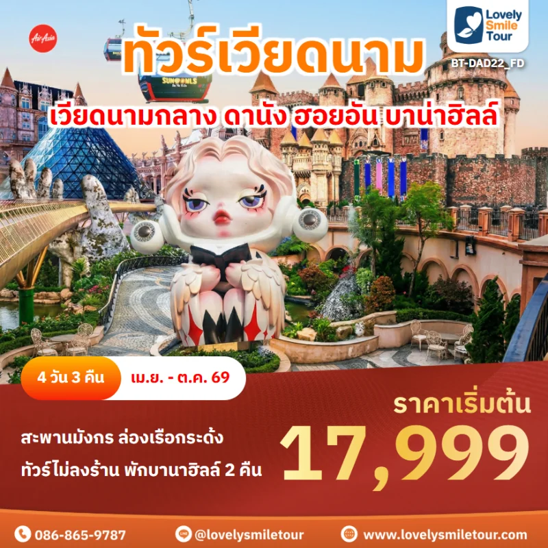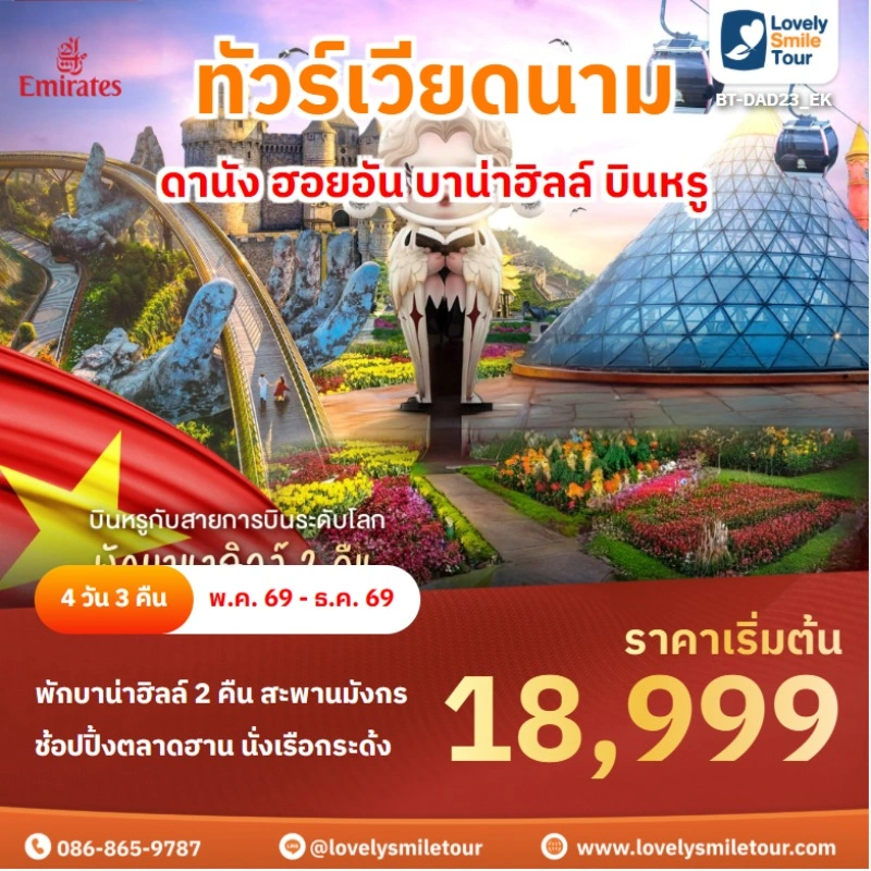 Lovely Smile Tour มีแพ็กเกจ ทัวร์เวียดนามกลาง หลากหลายรูปแบบให้เลือก ซึ่งถ้าต้องการให้ได้เที่ยวครบไฮไลท์สำคัญ แนะนำเป็นแบบ 4 วัน 3 คืน เพื่อให้ได้เที่ยวครบ 3 เมือง คือ ดานัง เว้ ฮอยอัน และแนะนำให้ลองพักบนบานาฮิลล์ 1 คืน และคืนที่เหลือพัก 4 ดาว ท่านจะประทับใจแน่นอน สนใจจองแพ็กเกจไหน แอดไลน์หรือโทรสอบถามได้เลย
