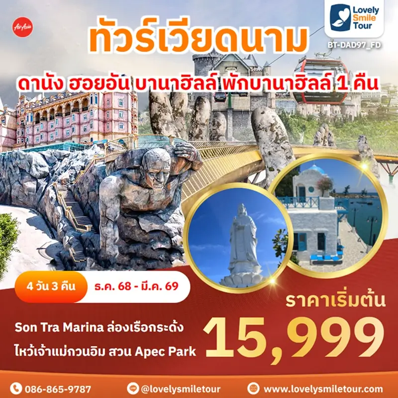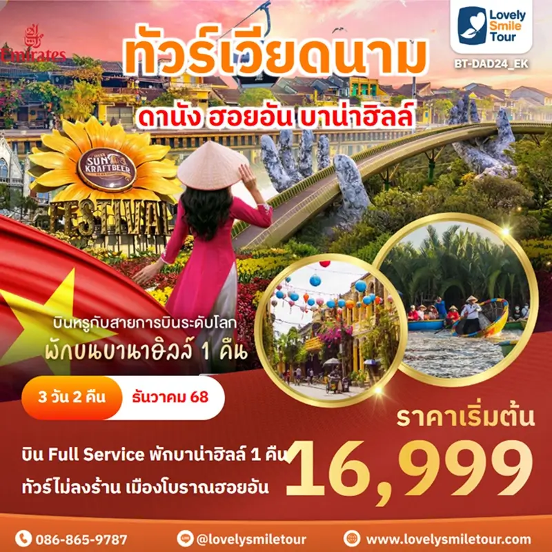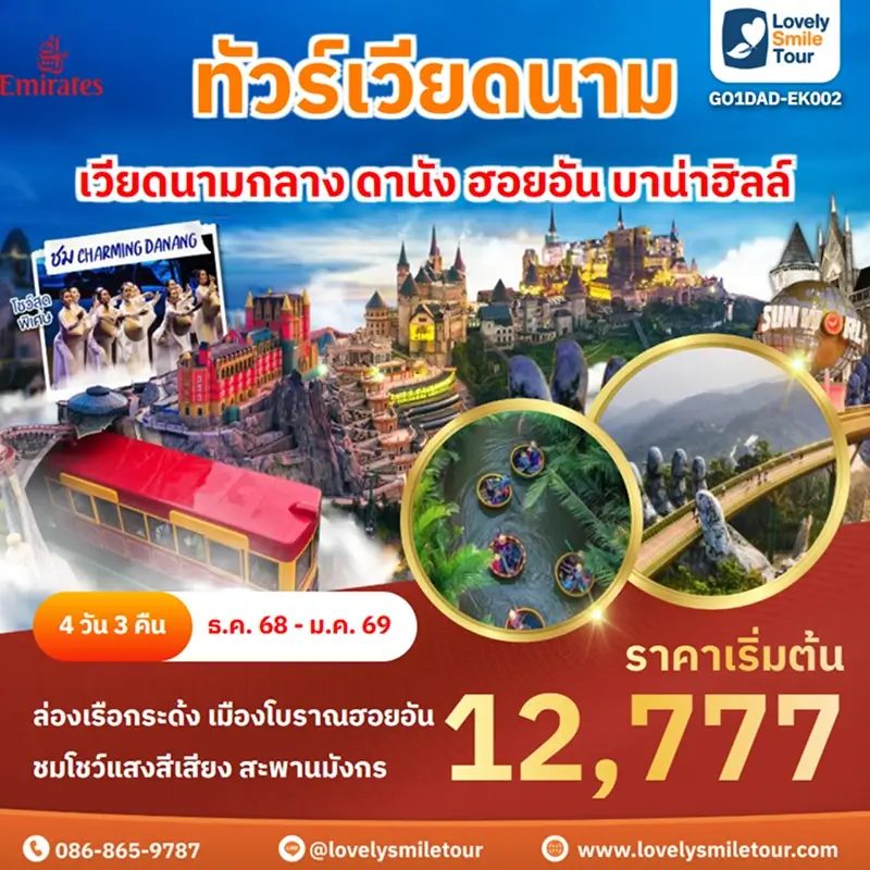Lovely Smile Tour มีแพ็กเกจ ทัวร์เวียดนามกลาง หลากหลายรูปแบบให้เลือก ซึ่งถ้าต้องการให้ได้เที่ยวครบไฮไลท์สำคัญ แนะนำเป็นแบบ 4 วัน 3 คืน เพื่อให้ได้เที่ยวครบ 3 เมือง คือ ดานัง เว้ ฮอยอัน และแนะนำให้ลองพักบนบานาฮิลล์ 1 คืน และคืนที่เหลือพัก 4 ดาว ท่านจะประทับใจแน่นอน สนใจจองแพ็กเกจไหน แอดไลน์หรือโทรสอบถามได้เลย