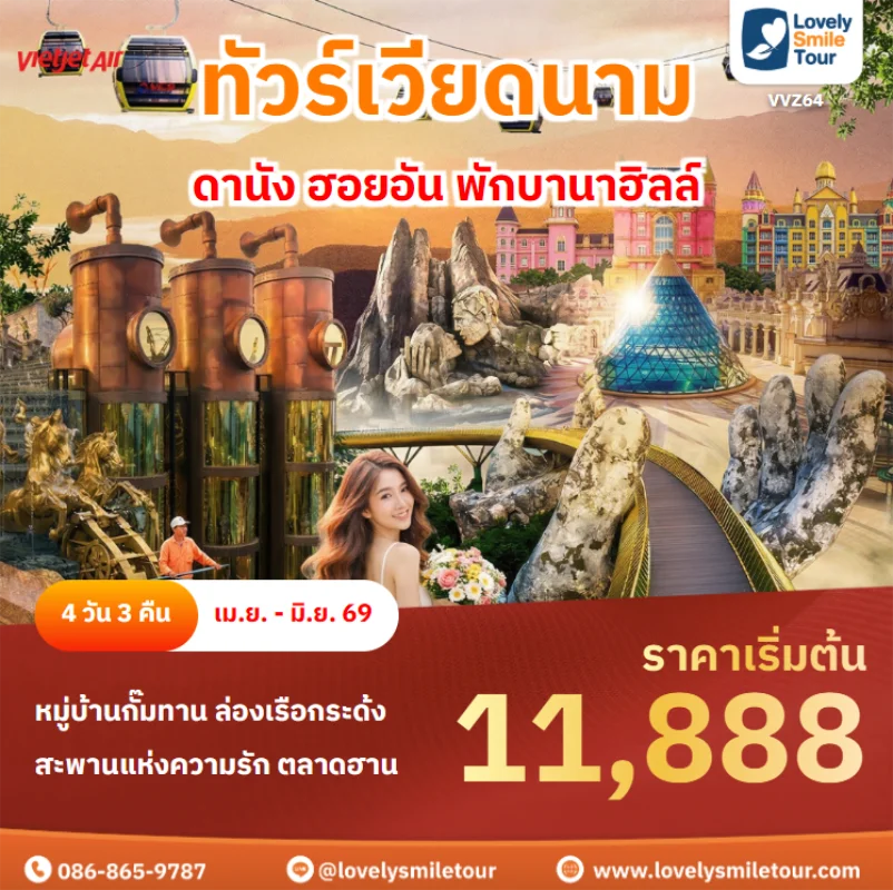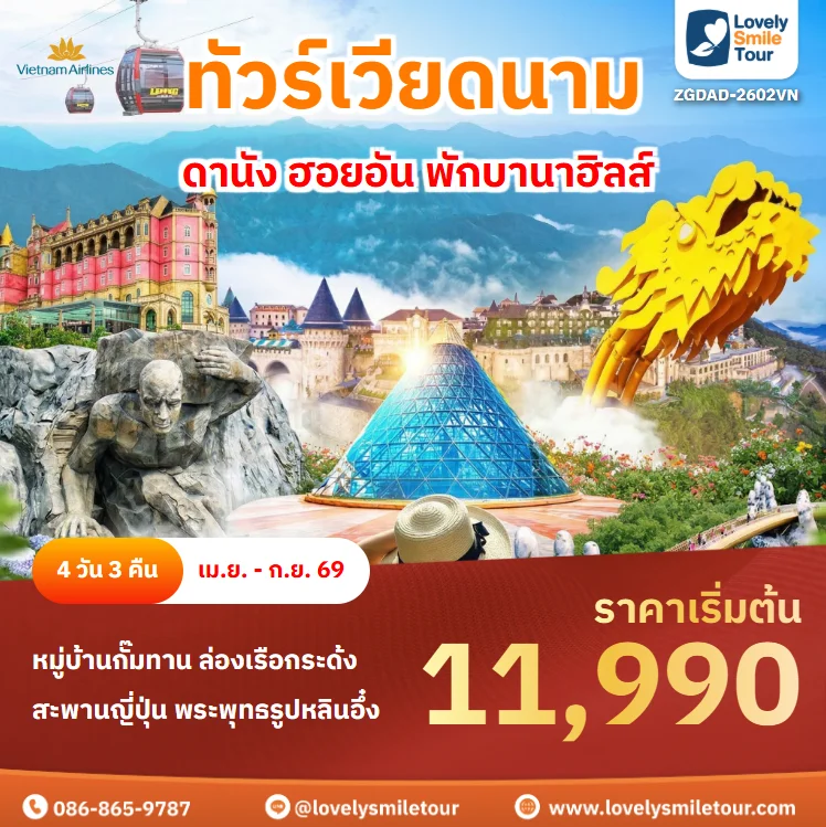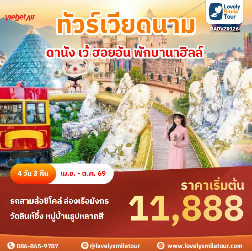 Lovely Smile Tour มีแพ็กเกจ ทัวร์เวียดนามกลาง หลากหลายรูปแบบให้เลือก ซึ่งถ้าต้องการให้ได้เที่ยวครบไฮไลท์สำคัญ แนะนำเป็นแบบ 4 วัน 3 คืน เพื่อให้ได้เที่ยวครบ 3 เมือง คือ ดานัง เว้ ฮอยอัน และแนะนำให้ลองพักบนบานาฮิลล์ 1 คืน และคืนที่เหลือพัก 4 ดาว ท่านจะประทับใจแน่นอน สนใจจองแพ็กเกจไหน แอดไลน์หรือโทรสอบถามได้เลย