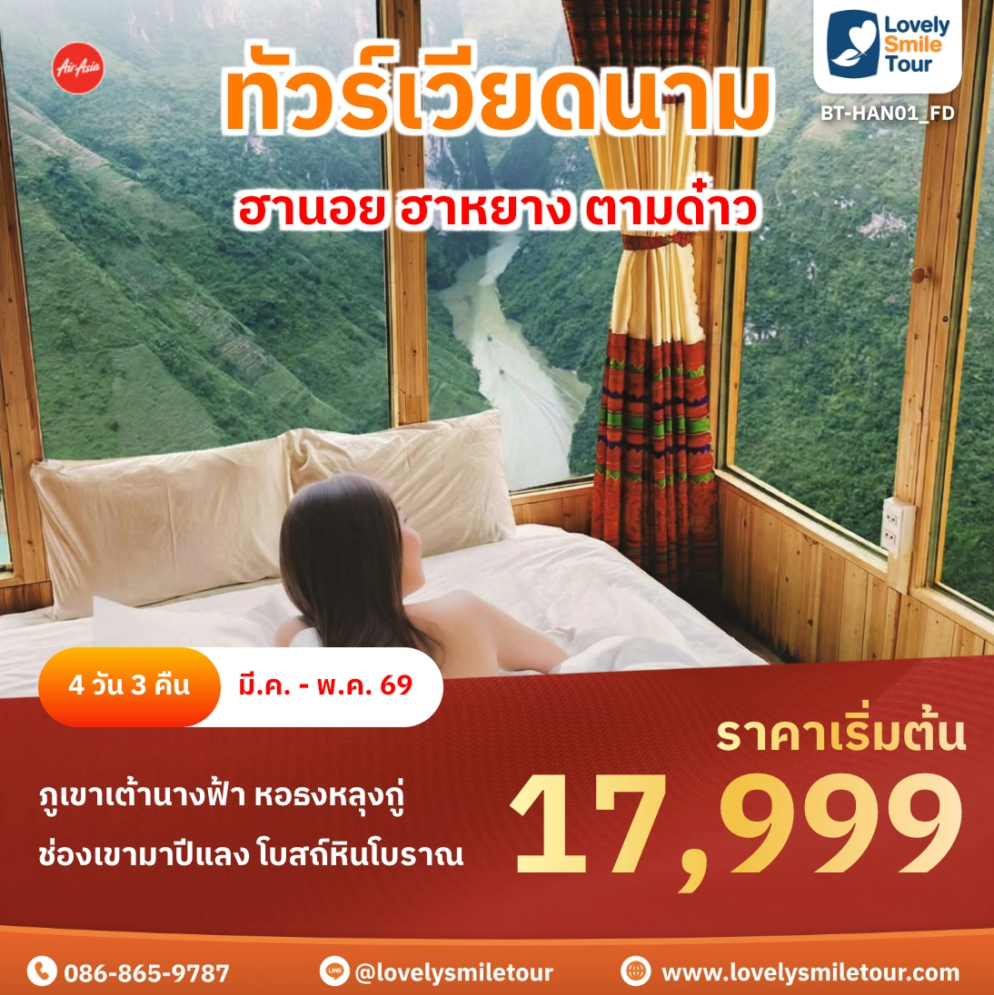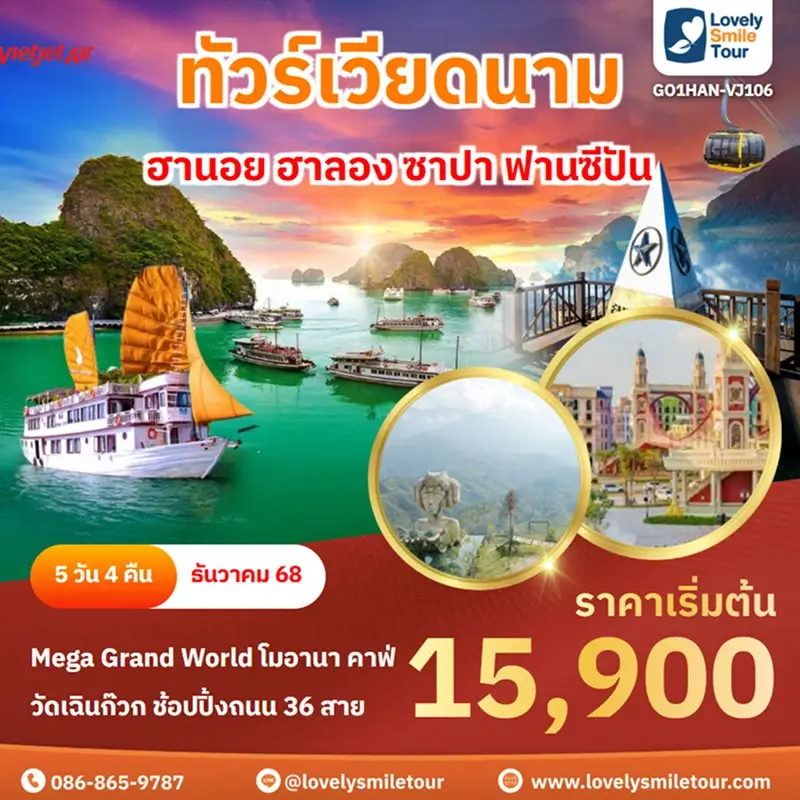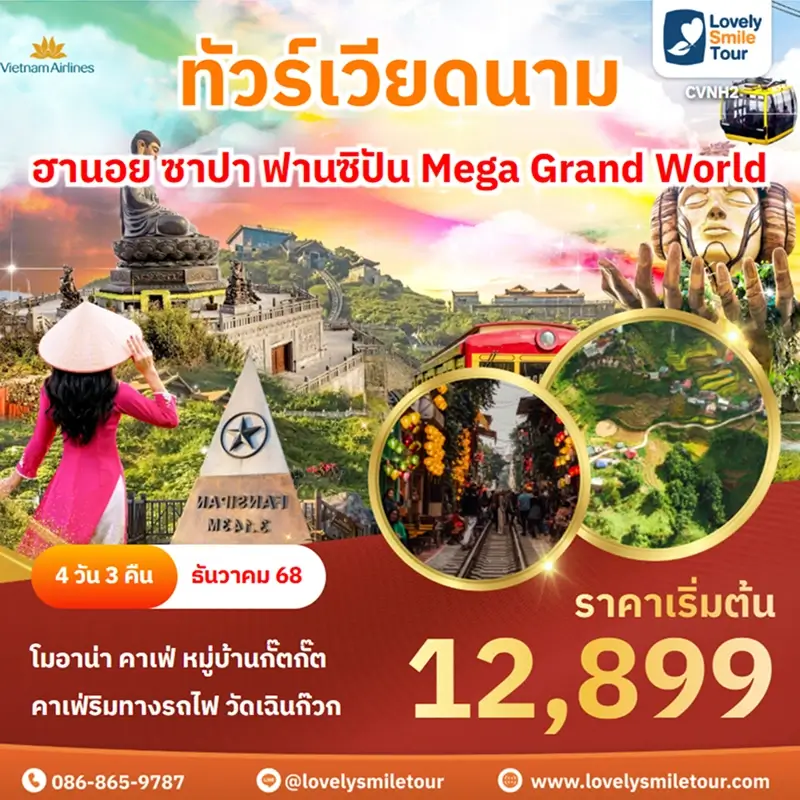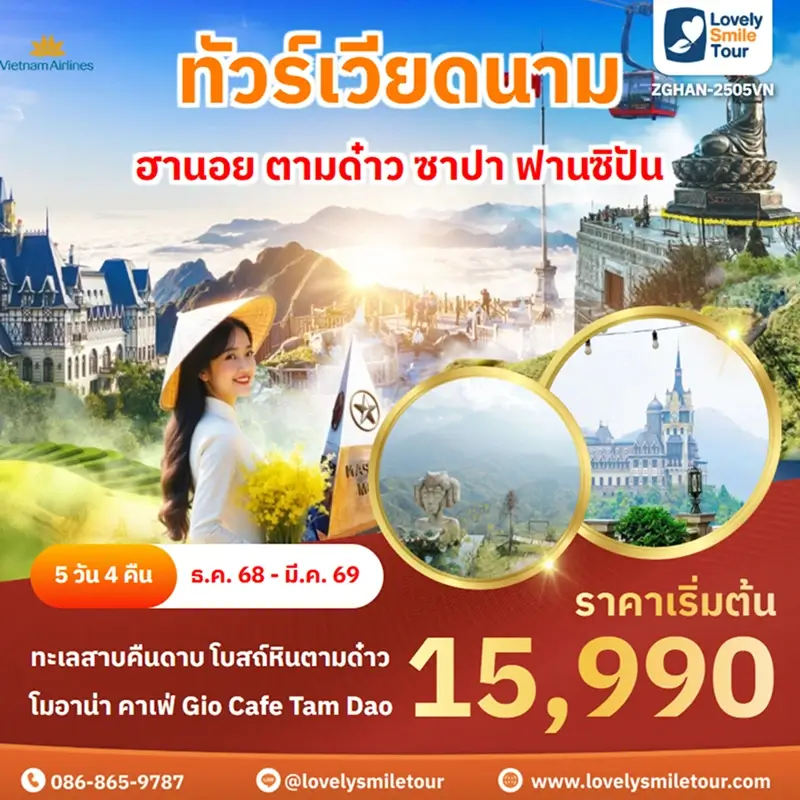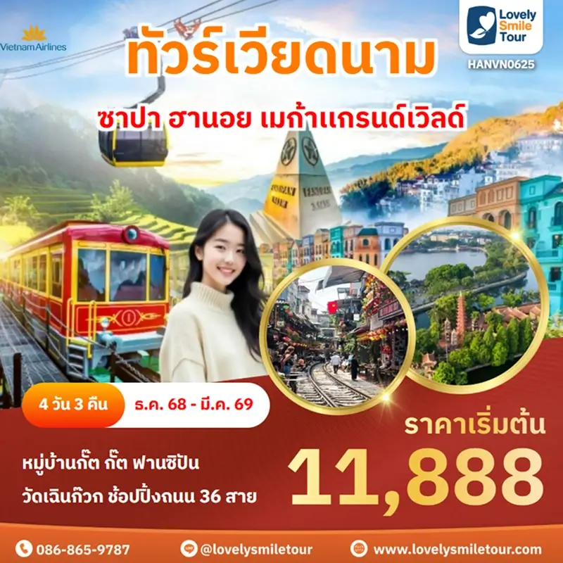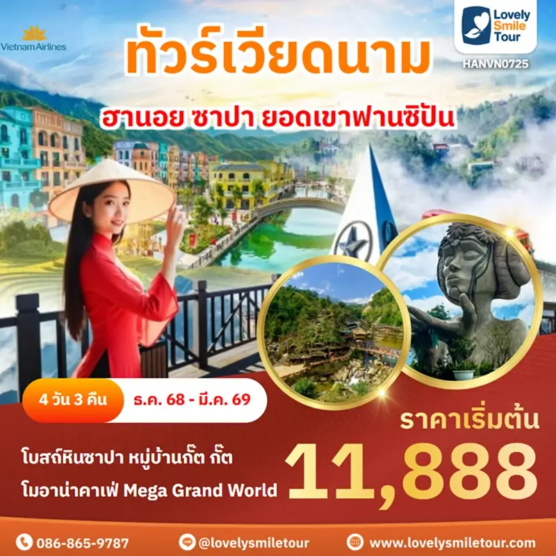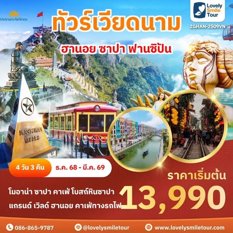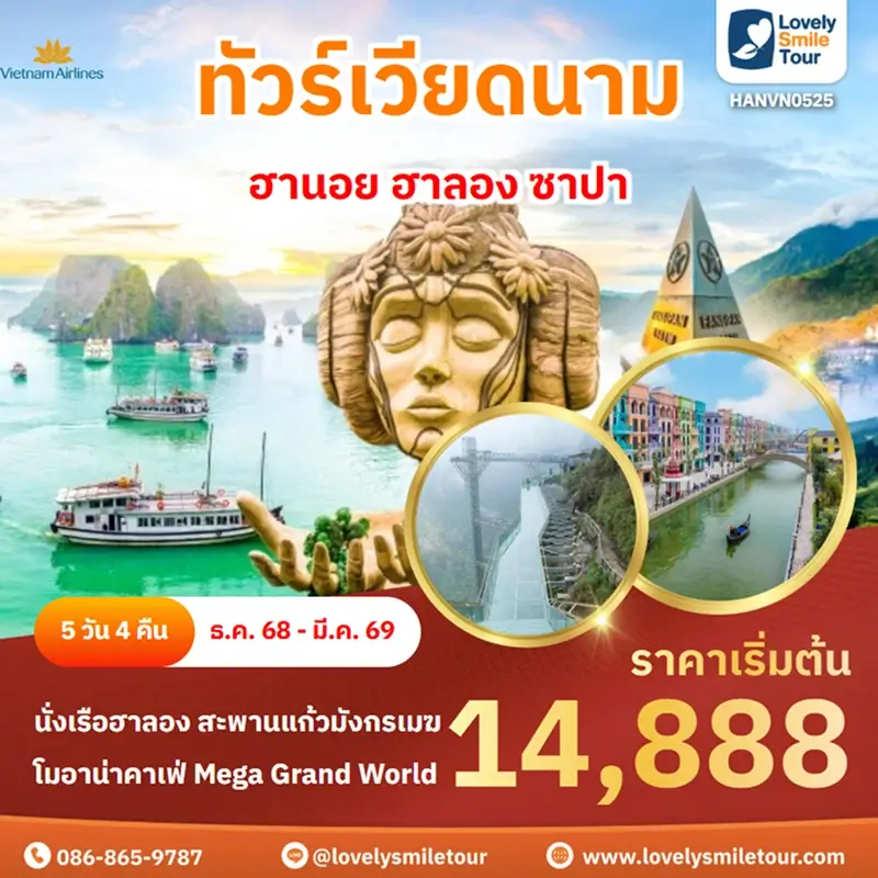 Lovely Smile Tour มีแพ็กเกจ ทัวร์เวียดนามเหนือ ให้เลือกหลากหลายรูปแบบ โดยแพ็กเกจยอดนิยมจะเป็นแบบ 4 วัน 3 คืน ซึ่งไฮไลท์สำคัญจะเป็น ซาปา ฟานซิปัน และฮานอย หรือถ้ามีเวลามากขึ้น แนะนำไปแบบ 5 วัน 4 คืน จะสามารถไปเที่ยวนิงห์บิงห์ ฮาลอง ได้อีกด้วย สนใจจองแพ็กเกจไหน แอดไลน์หรือโทรสอบถามได้เลย