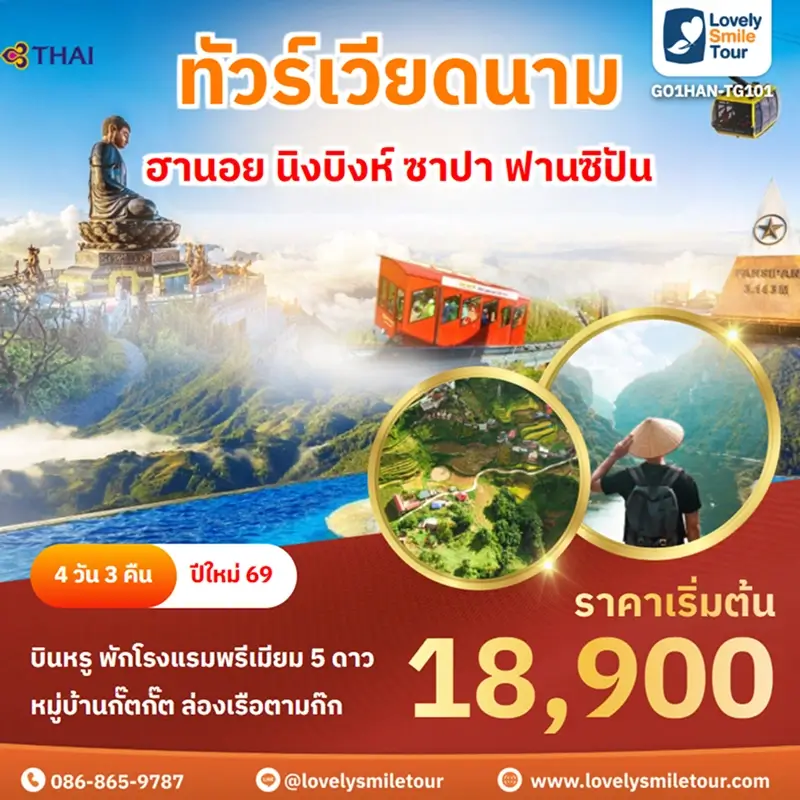 Lovely Smile Tour มีแพ็กเกจ ทัวร์เวียดนามเหนือ ให้เลือกหลากหลายรูปแบบ โดยแพ็กเกจยอดนิยมจะเป็นแบบ 4 วัน 3 คืน ซึ่งไฮไลท์สำคัญจะเป็น ซาปา ฟานซิปัน และฮานอย หรือถ้ามีเวลามากขึ้น แนะนำไปแบบ 5 วัน 4 คืน จะสามารถไปเที่ยวนิงห์บิงห์ ฮาลอง ได้อีกด้วย สนใจจองแพ็กเกจไหน แอดไลน์หรือโทรสอบถามได้เลย