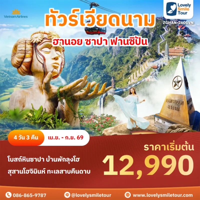Lovely Smile Tour มีแพ็กเกจ ทัวร์เวียดนามเหนือ ให้เลือกหลากหลายรูปแบบ โดยแพ็กเกจยอดนิยมจะเป็นแบบ 4 วัน 3 คืน ซึ่งไฮไลท์สำคัญจะเป็น ซาปา ฟานซิปัน และฮานอย หรือถ้ามีเวลามากขึ้น แนะนำไปแบบ 5 วัน 4 คืน จะสามารถไปเที่ยวนิงห์บิงห์ ฮาลอง ได้อีกด้วย สนใจจองแพ็กเกจไหน แอดไลน์หรือโทรสอบถามได้เลย