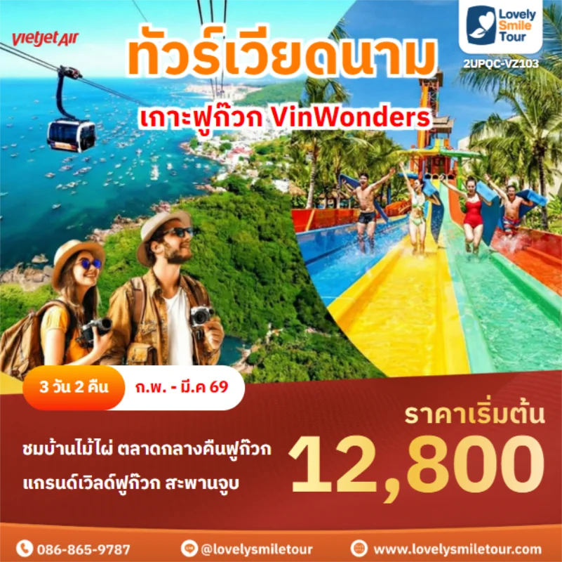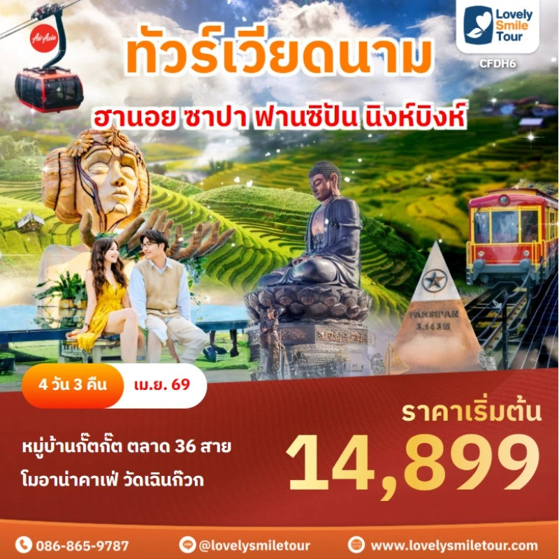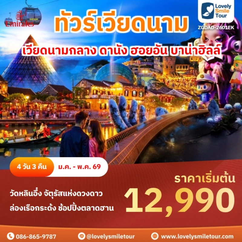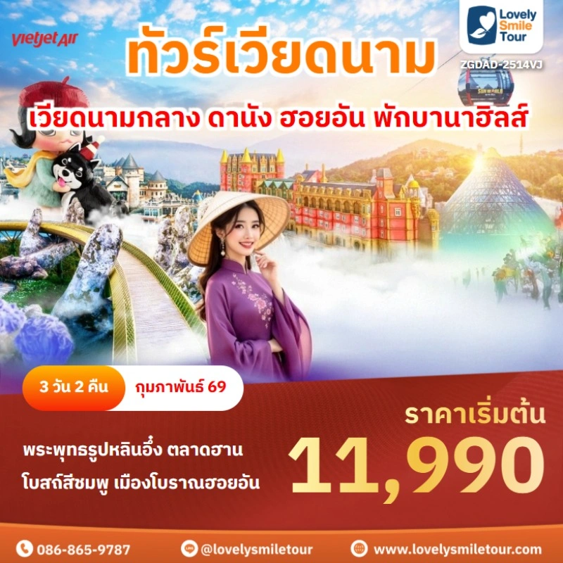 Lovely Smile Tour มีแพ็กเกจ ทัวร์เวียดนาม เหนือ กลาง ใต้ ให้เลือกหลายหลายรูปแบบ โดยแพ็กเกจที่เป็นที่นิยมจะเป็น ทัวร์เวียดนามกลาง 4 วัน 3 คืน ซึ่งเป็นโปรแกรมเที่ยวที่มีสถานที่เที่ยวหลากหลาย ไม่ว่าจะเป็นเที่ยวบานาฮิลล์ เที่ยวธรรมชาติ โบราณสถาน ล่องเรือ ช้อปปิ้ง และที่สำคัญเดินทางไม่เหนื่อยด้วย แต่ถ้าชอบเที่ยวธรรมชาติ ชมวิวบนเขา แนะนำเวียดนามเหนือ ซาปา ฟานซิปัน หรือถ้าชอบชมทะเลทราย สวนดอกไม้ แนะนำเวียดนามใต้ สนใจจองแพ็กเกจไหน แอดไลน์หรือโทรสอบถามได้เลย