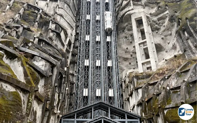 การเดินทางไปยังอุทยานหลุมฟ้า จะเดินทางด้วยการลงลิฟต์แก้วขนาดใหญ่ที่ติดอยู่กับหน้าผา ที่มีความสูงกว่า 80 เมตร เพื่อพาลงสู่ก้นหุบเขา ระหว่างที่ลิฟต์เคลื่อนตัว ลิฟต์จะหมุน 360 องศา ทำให้เห็นวิวหุบเขาแบบพาโนรามาที่สวยงามและหวาดเสียวในเวลาเดียวกัน